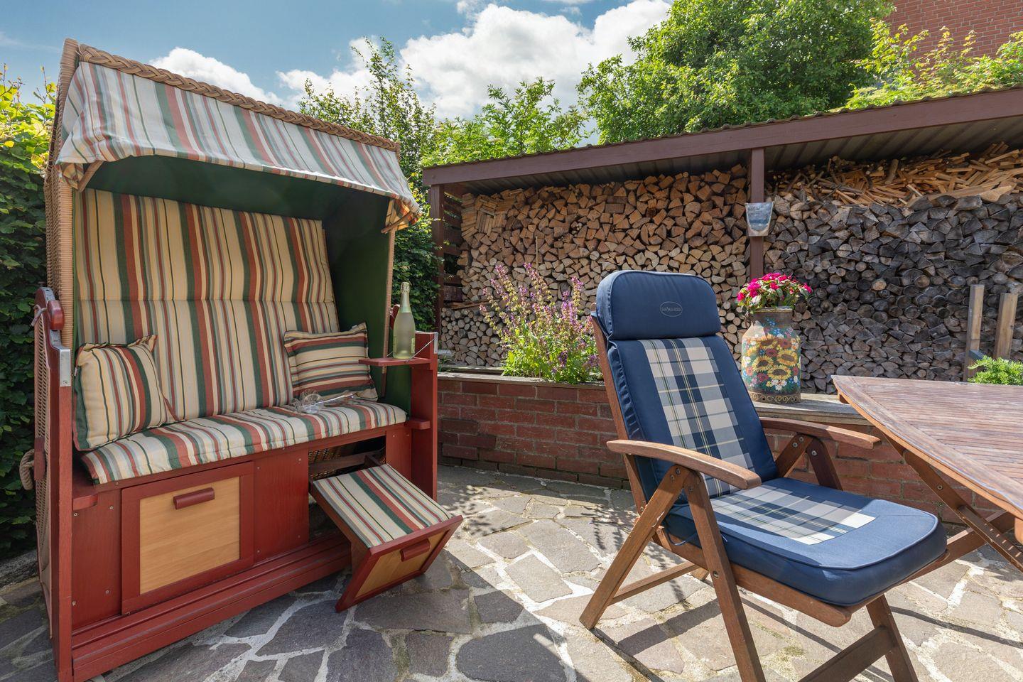 Zu den besonderen Vorzügen der Unterkunft gehören eine private Terrasse im Außenbereich zur gemeinschaftlichen Nutzung mit der Ferienwohnung "Norden", auf der Gartenmöbel und ein Sonnenschirm zur Verfügung stehen.