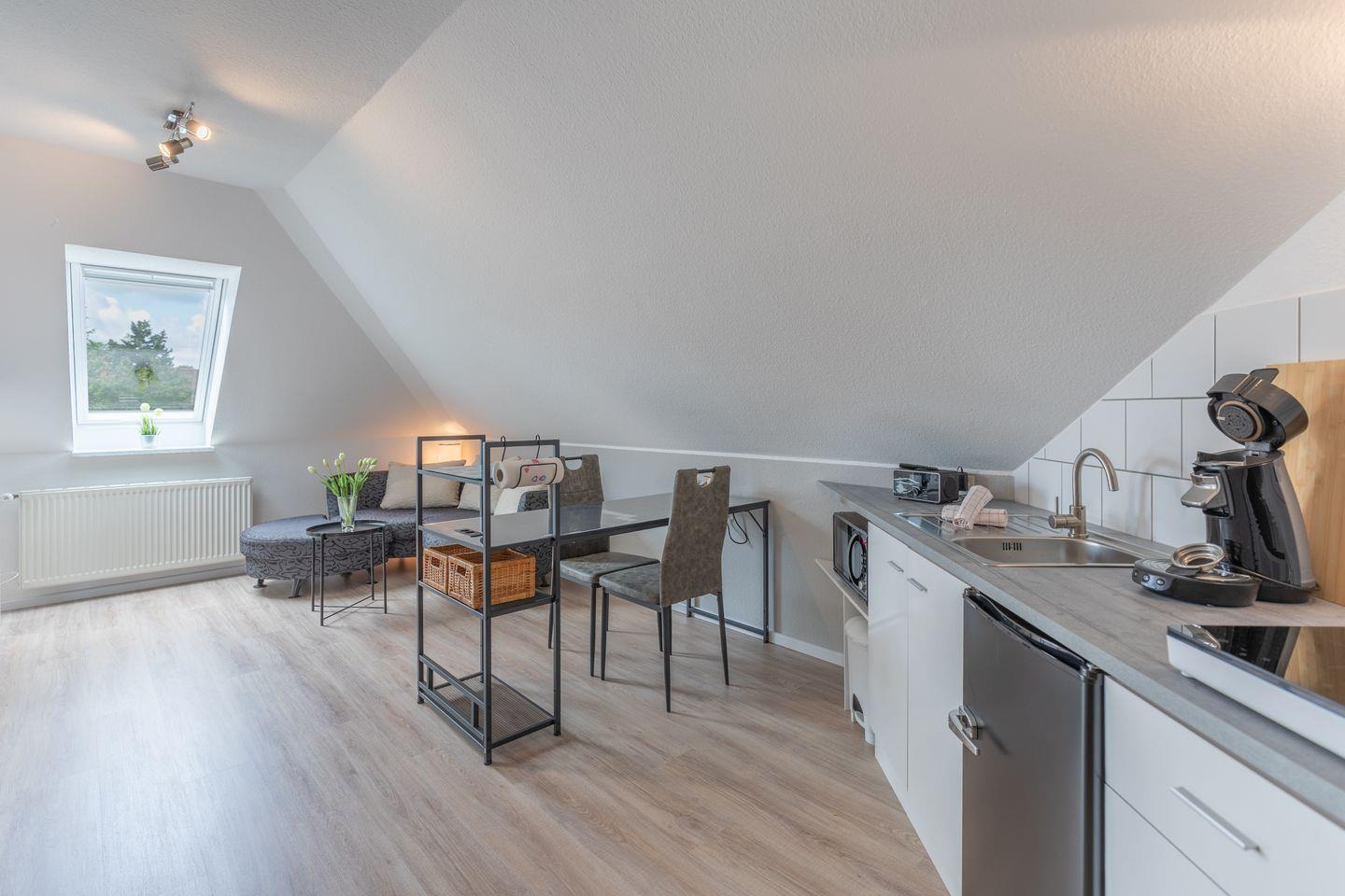Die Küche ist voll ausgestattet und überzeugt mit Ceranherd, Mikrowelle, Kühlschrank, Gefrierfach, Wasserkocher, Espressokaffeemaschine, Eierkocher, Toaster sowie vielfältigem Kochzubehör. Geschirr, Besteck und Küchenutensilien gehören zur Ausstattung dazu.