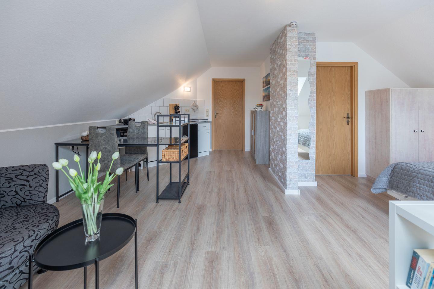 Die unmittelbare Umgebung ist geprägt von ruhigem Dorfcharakter. Einkaufsmöglichkeiten sind nur 300 Meter entfernt und somit schnell zu Fuß erreichbar. Die Nordsee mit dem nächsten Strand erreichen Sie nach etwa 3.000 Metern – optimal für Ausflüge ans Meer, ohne auf die Ruhe eines ländlichen Domizils zu verzichten. Durch die Lage im ersten Stock eines Hauses mit nur einer Etage genießen Sie einen geschützten Rückzugsort mit Blick ins Grüne.