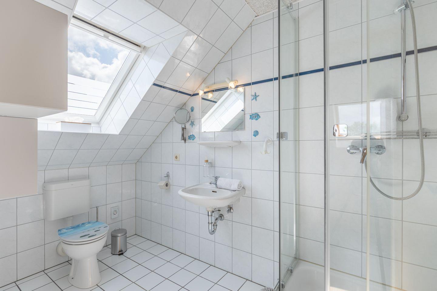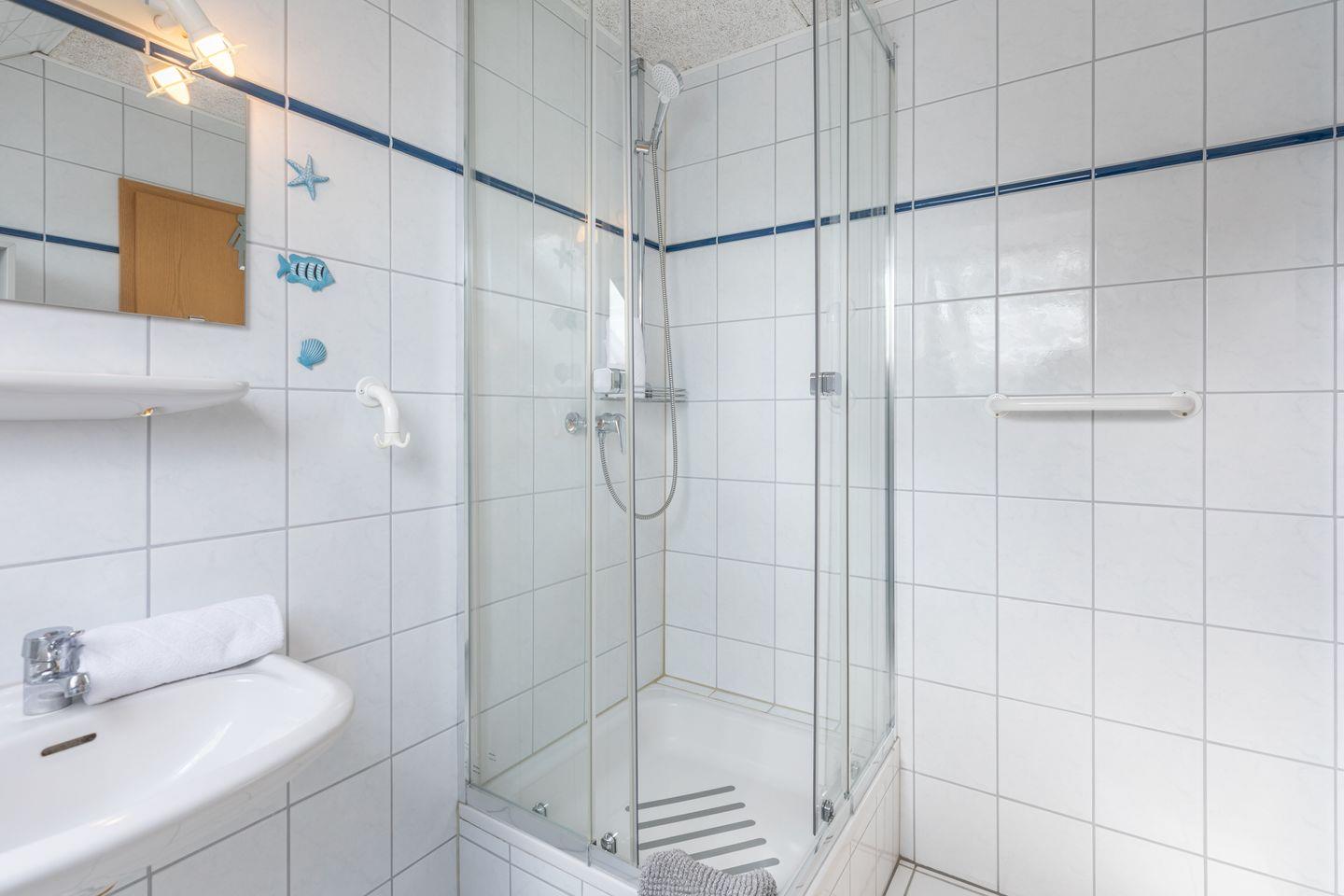 Die Küche ist vollständig ausgestattet und umfasst einen Ceranherd, Backofen, Kühlschrank mit Gefrierfach, Kaffeemaschine (Filtermaschine), Toaster, Wasserkocher, Eierkocher, Geschirr, Besteck sowie Küchenutensilien. Somit sind sowohl die Zubereitung kleinerer Snacks als auch vollwertiger Mahlzeiten problemlos möglich. Für den Komfort im Bad sorgen eine Dusche, ein Waschbecken, ein WC, ein Haartrockner sowie ein Kosmetikspiegel und Spiegel.