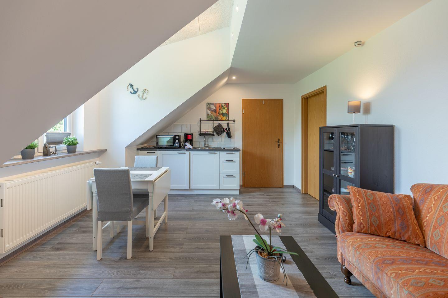 Der offene Wohnbereich ist mit einem Sofa und einem Sessel komfortabel eingerichtet – ein Esstisch bietet einen angenehmen Platz für gemeinsame Mahlzeiten. Für Unterhaltung sorgen Bücher, Spiele, ein Fernseher, Radio sowie ein stabiler Internetzugang über WLAN mit einer Geschwindigkeit ab 500 Mbit/s. Das separate Schlafzimmer (Bettgröße 180 × 200 cm) ist mit allen notwendigen Ausstattungen versehen und ein Babybett steht zusätzlich zur Verfügung, sodass auch kleine Kinder willkommen sind.