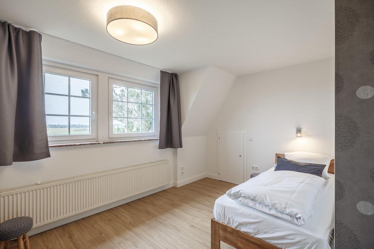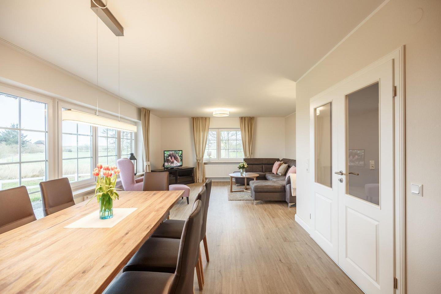 Genießen Sie den Weitblick und die Natur: Dort, wo sich der Hase und Fuchs „Gute Nacht“ sagen, finden Sie unser exklusives Ferienhaus unter Reet. Egal aus welchem Fenster Sie schauen, erwartet Sie der Blick auf den Deich oder aber Felder mit Schafen und Pferden.