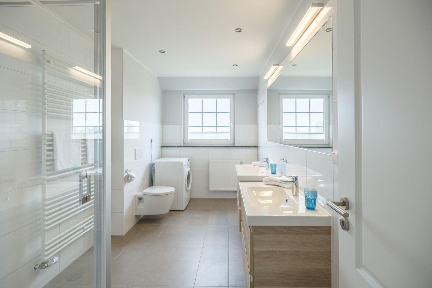 Das schicke Duschbad im Obergeschoss mit zwei Waschbecken und einer Waschmaschine, ein weiteres Duschbad im Erdgeschoss sowie ein Gäste-WC runden das Bild ab.