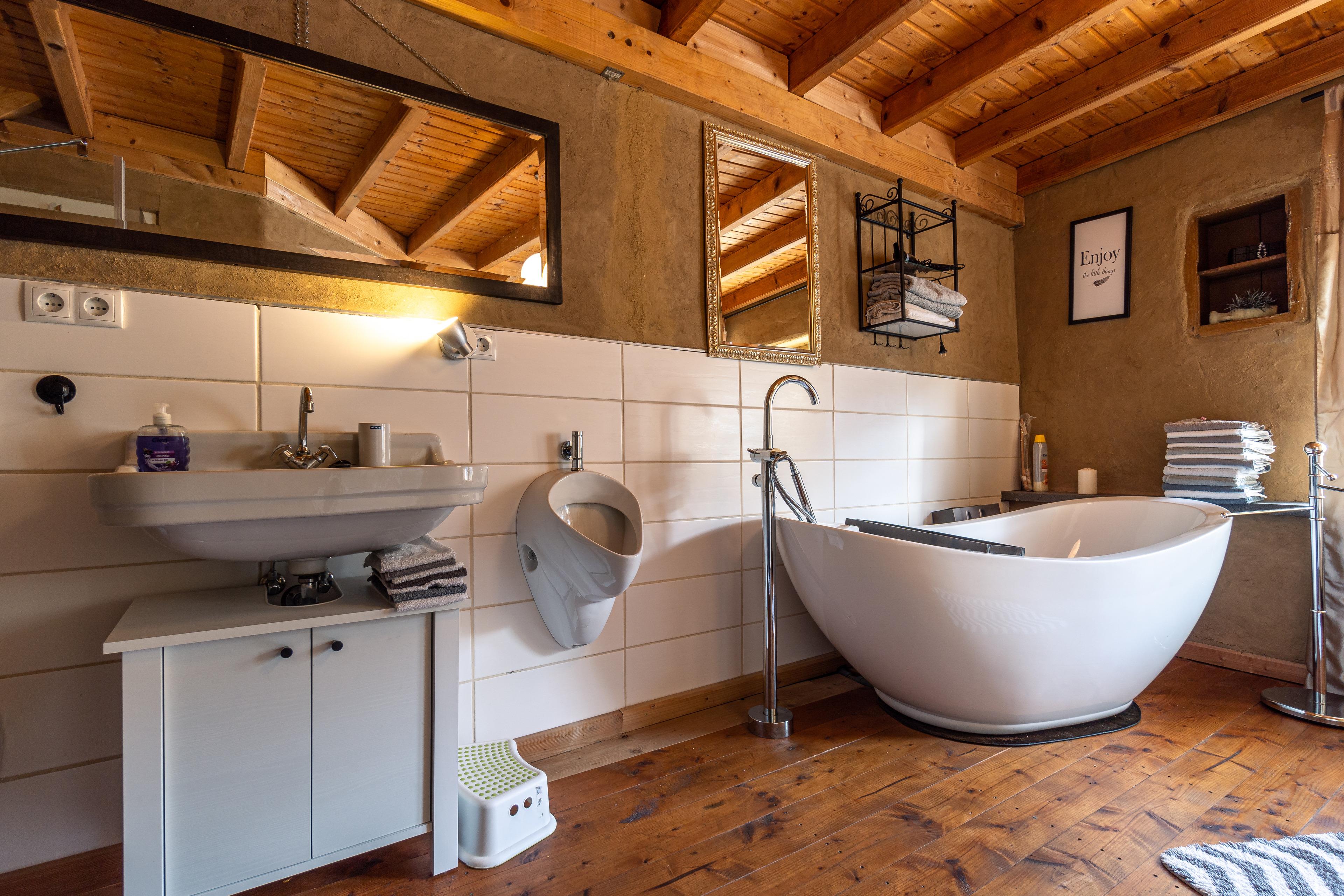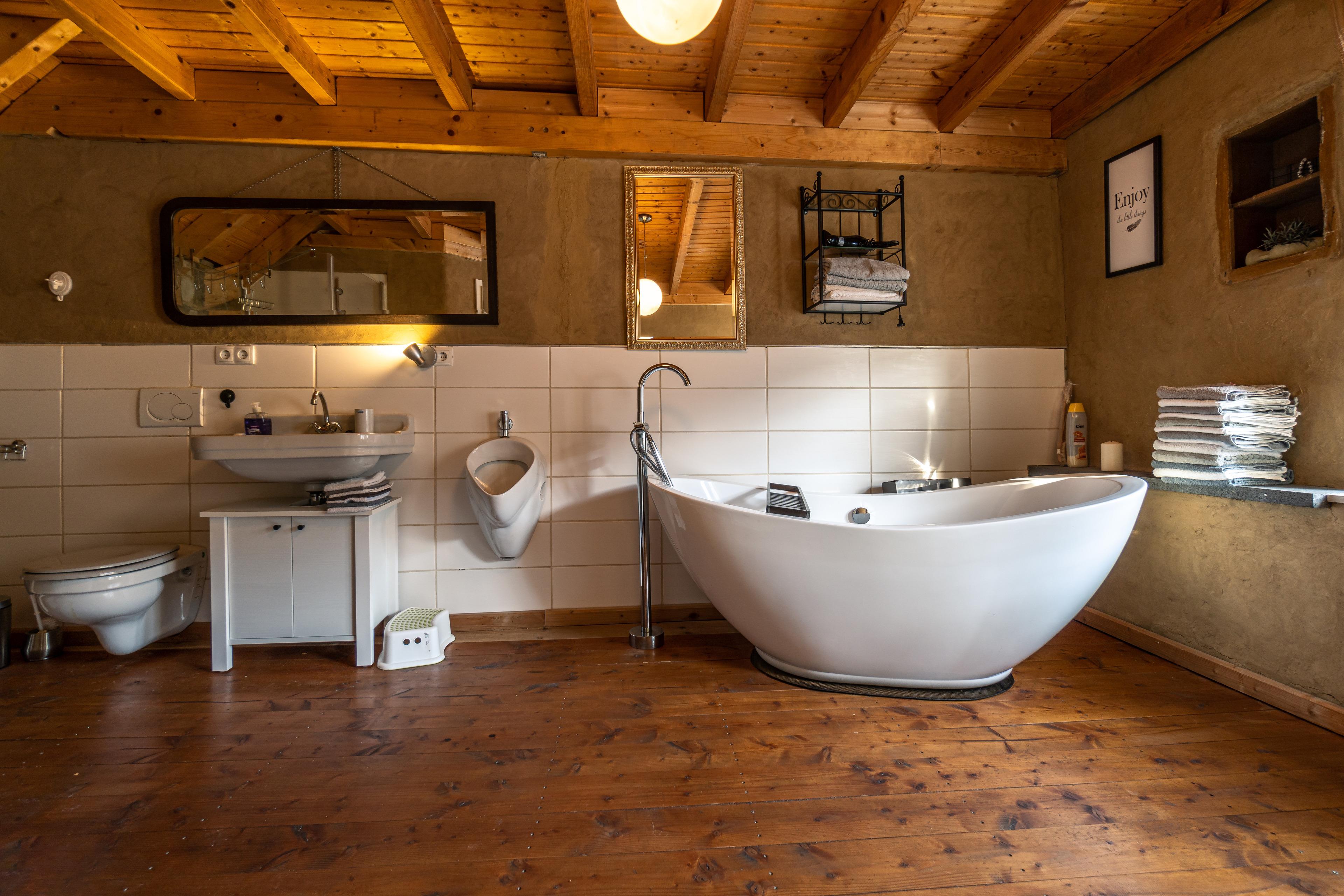 Verwinkelte Räume, freistehende Badewanne, Holzdielen und raffinierte Konstruktionen mit freiem Blick auf die Holzbalken laden zum kuscheln & verweilen ein.