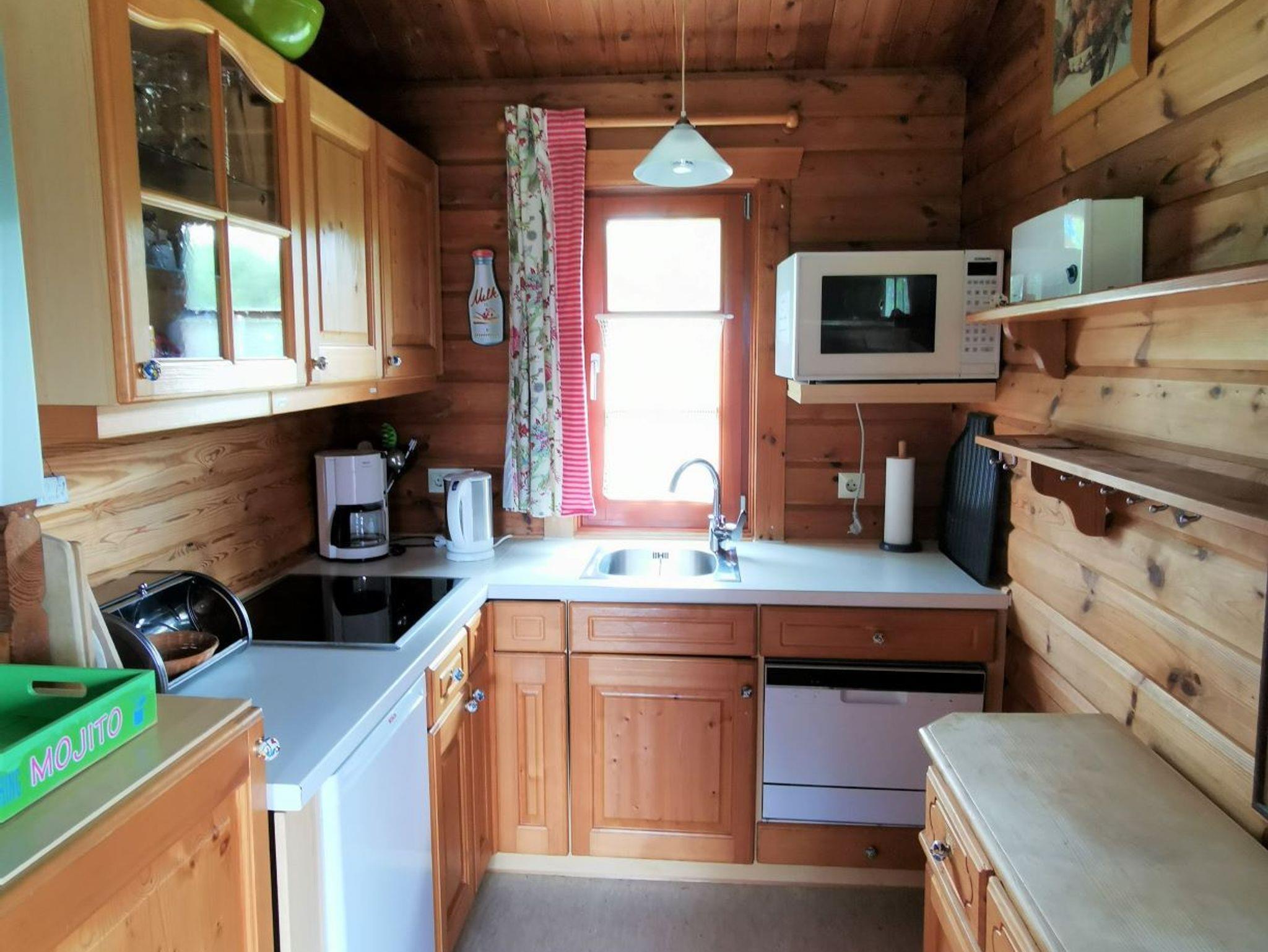 Die kleine Holzeinbauküche ist mit Spülmaschine, Mikrowelle mit integriertem Heißluftbackofen, Ceran-Kochfeld und Kühlschrank mit Gefrierfach ausgestattet und bietet einen leeren Schrank für Vorräte, offene Regalfläche und Platz für einen Einkaufskorb.