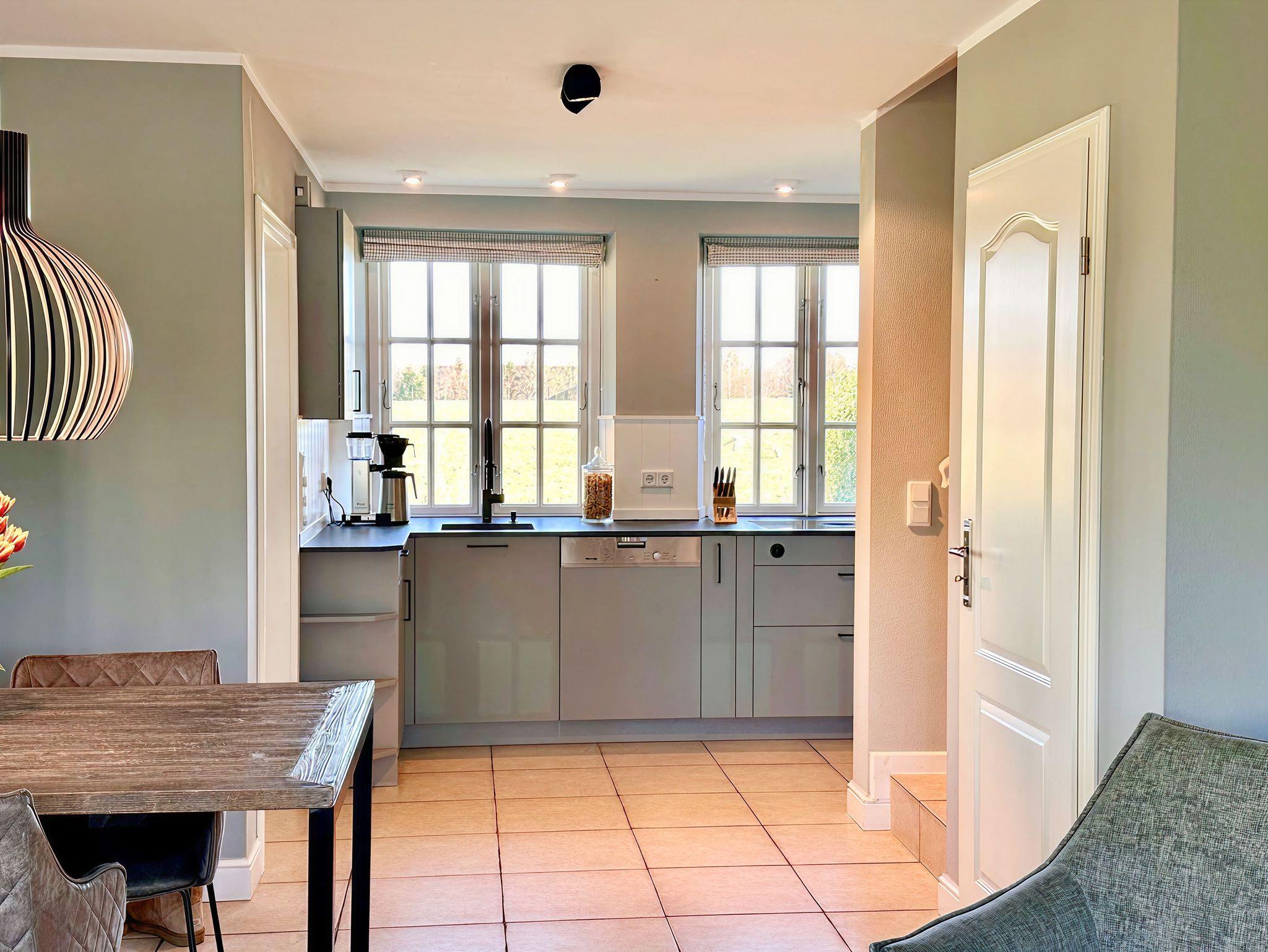 Innen erwartet Sie eine moderne Ausstattung, eine neue, voll ausgestattete Küche, ein Wellnessbereich mit Sauna und ein gemütliches Ambiente mit Kamin unter dem charmanten Reetdach.