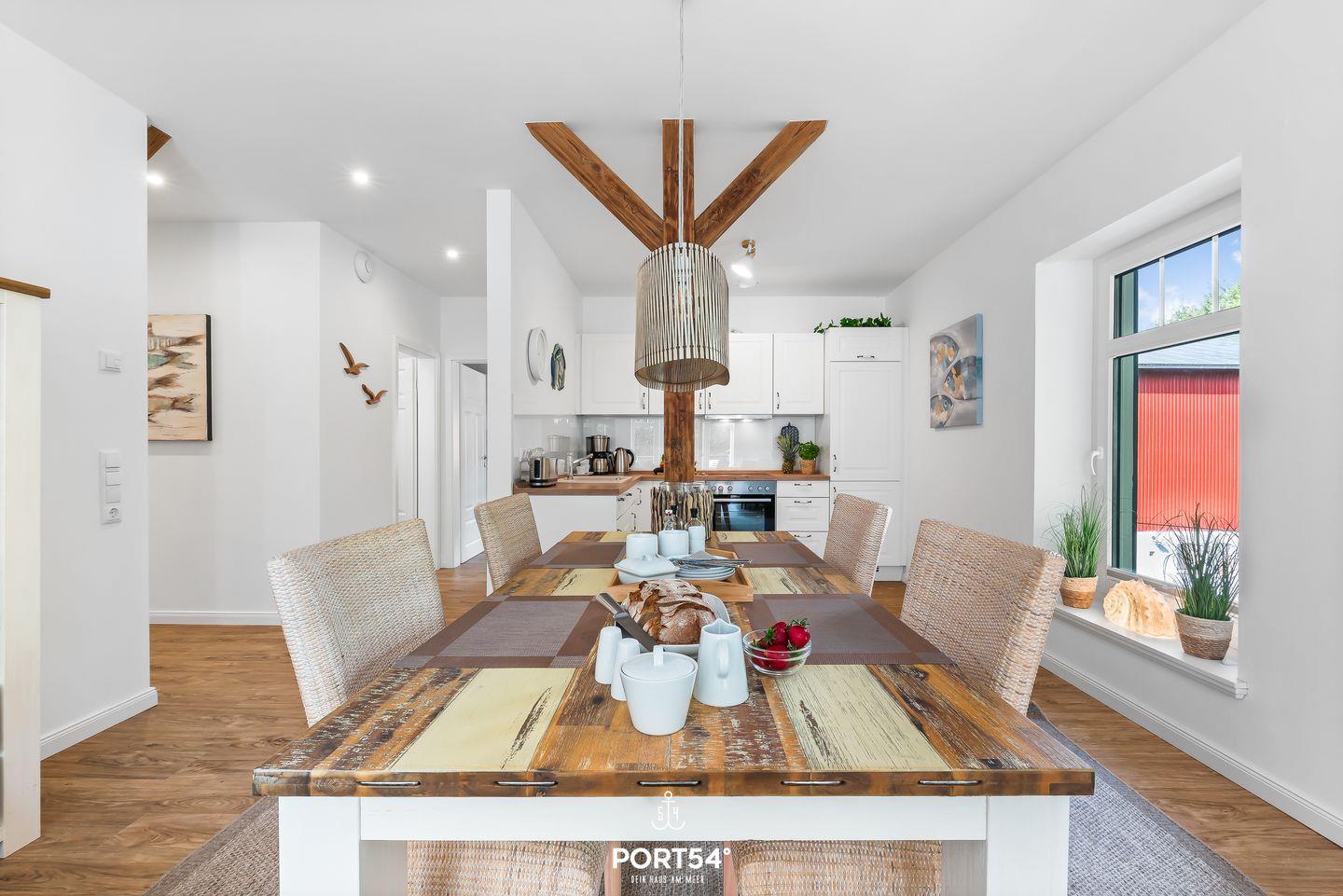 Der offene und hochwertige Wohn- und Essbereich mit voll ausgestatteter Küche und modernen Geräten lädt dazu ein, köstliche Mahlzeiten zuzubereiten.