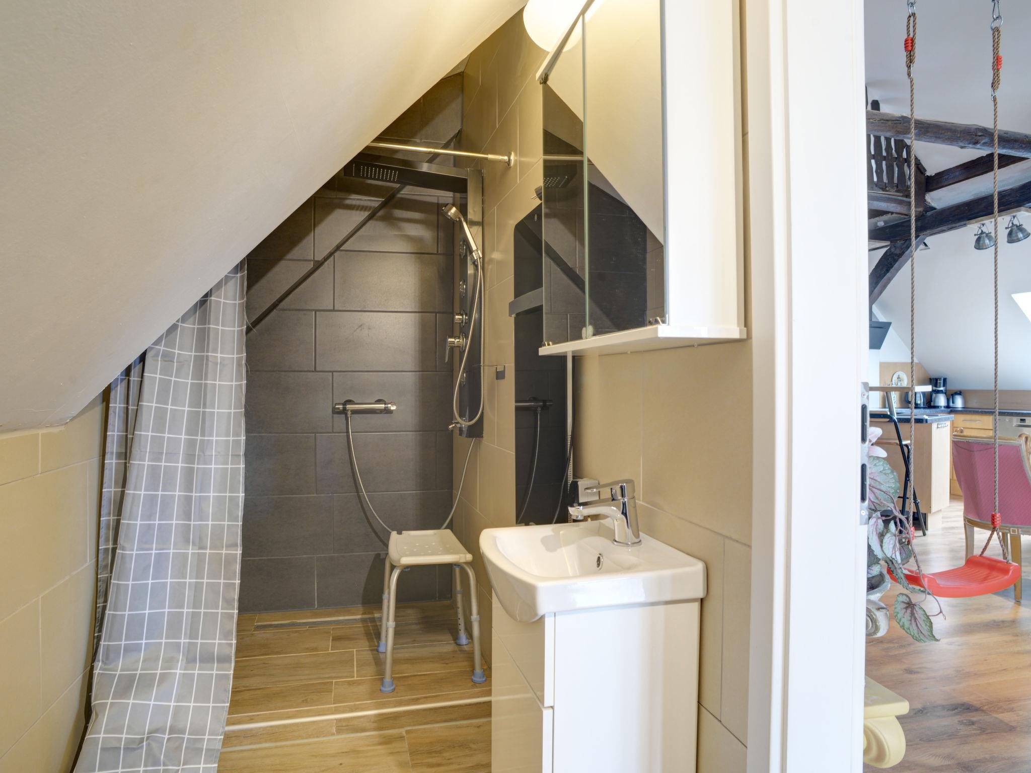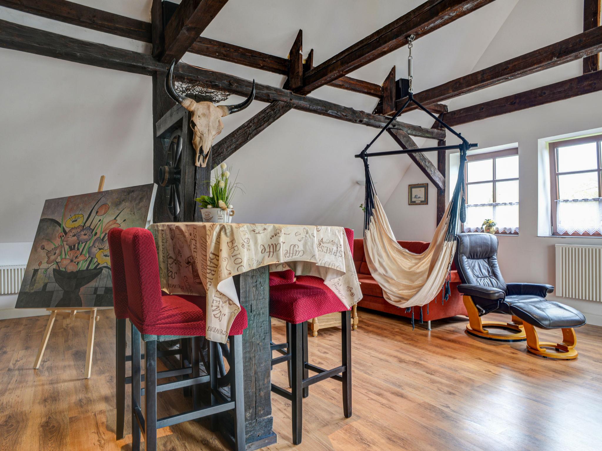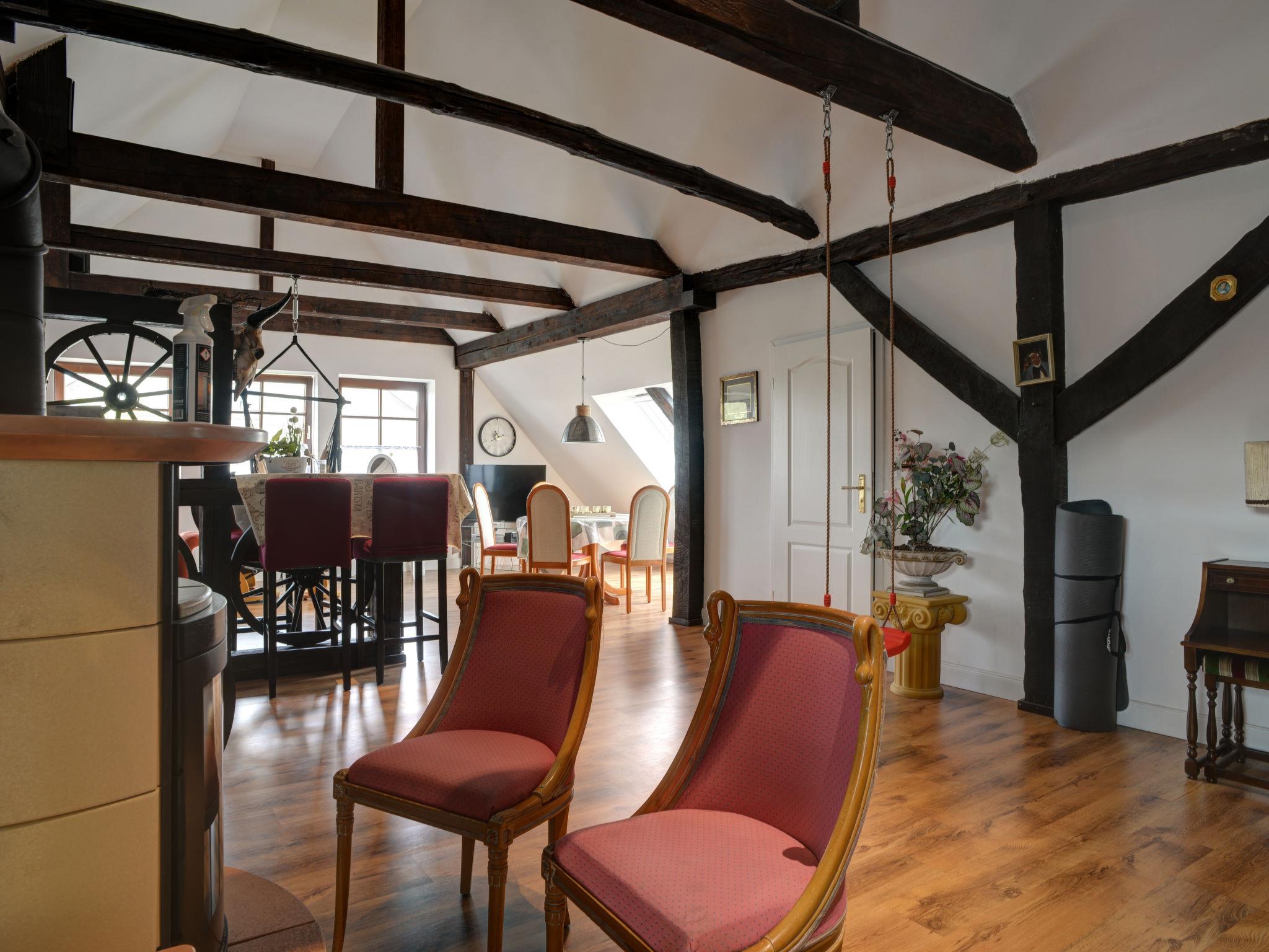"Atelier an der Kirche", 2-room maisonette 130 m2 on 2 levels, on the top floor. Object suitable for 4 adults + 2 children. Spacious and bright, with sloping ceilings, comfortable and tasteful furnishings: 2nd upper floor: living/sleeping room with curtain with 1 double sofabed (200 cm, length 200 cm), 1 double bed, dining table, satellite TV and hi-fi system. Open kitchen (dishwasher, 4 ceramic glass hob hotplates, toaster, kettle, microwave, electric coffee machine) with Scandinavian wood stove, dining table and bar. 2 showers/WC. Top floor: (spiral staircase) open, with sloping ceilings, ceiling height 160 cm with 2 beds (90 cm, length 200 cm). Electric heating. Parquet floors. Facilities: children's high chair, baby cot. Internet (WiFi, free). Please note: non-smokers only. Maximum 1 pet/ dog allowed. Smoke alarm, fire extinguisher.