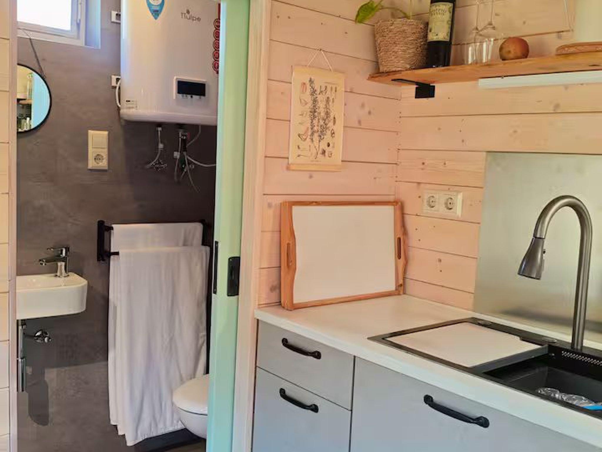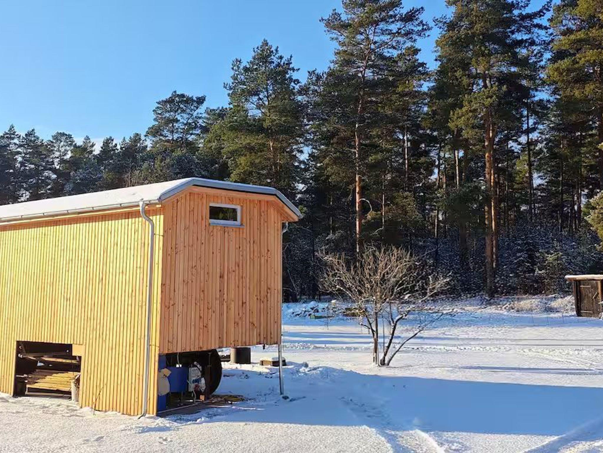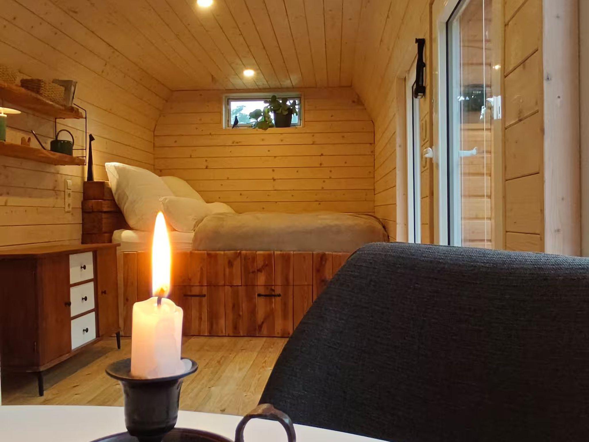 Aus dem alten Bauwagen ist mit viel Holz und Liebe etwas Besonderes entstanden. Fünf Fenster und eine Glastür sorgen für Licht und Ausblick auf Garten und Wald. Mit der modernen Küchenzeile und dem kleinen Badezimmer bietet der Wagen alles für eine Auszeit in der Niederlausitz.