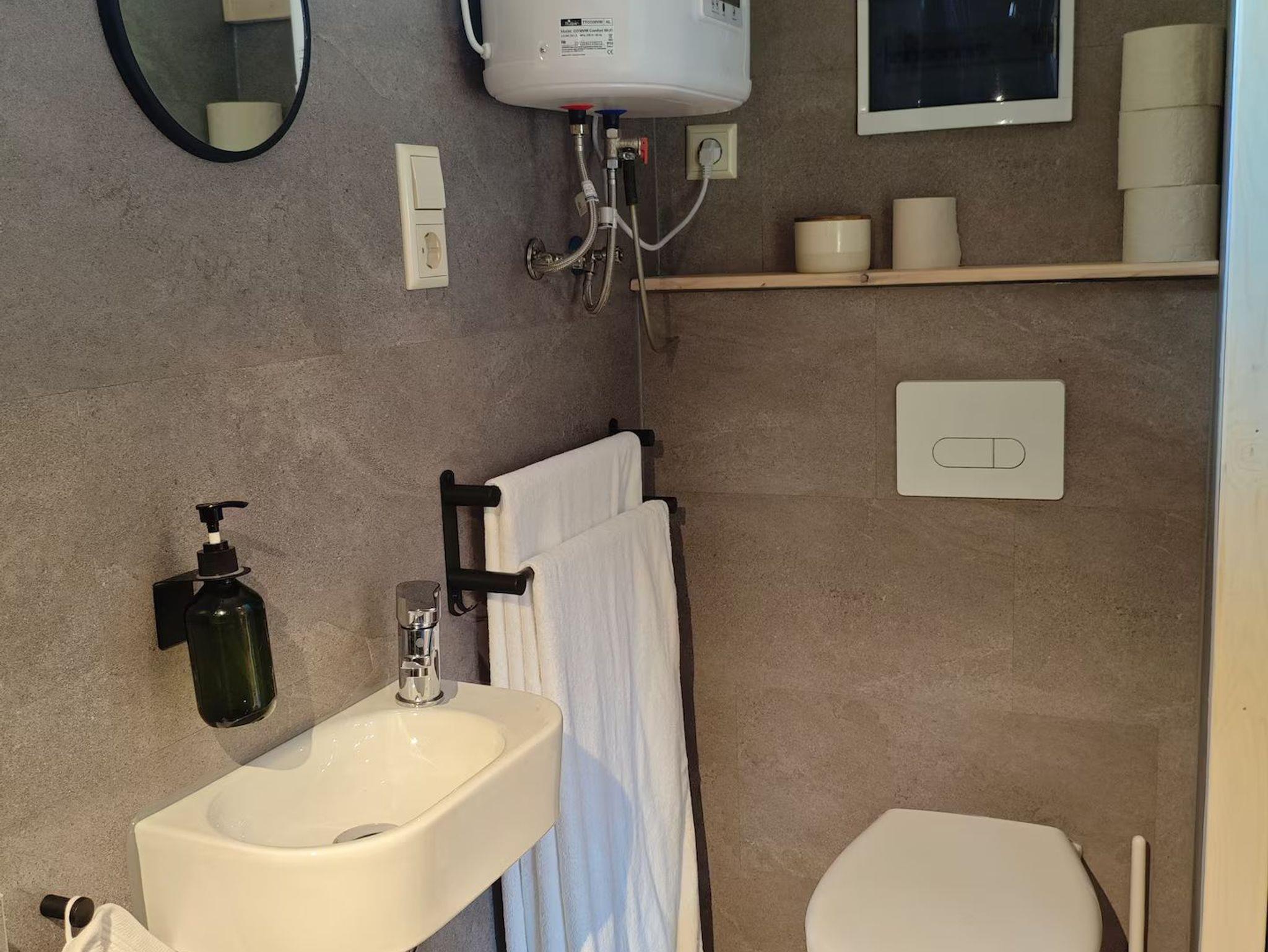 Auf der anderen Stirnseite des Wagens befindet sich ein kleines Badezimmer mit Dusche, WC und Waschbecken.