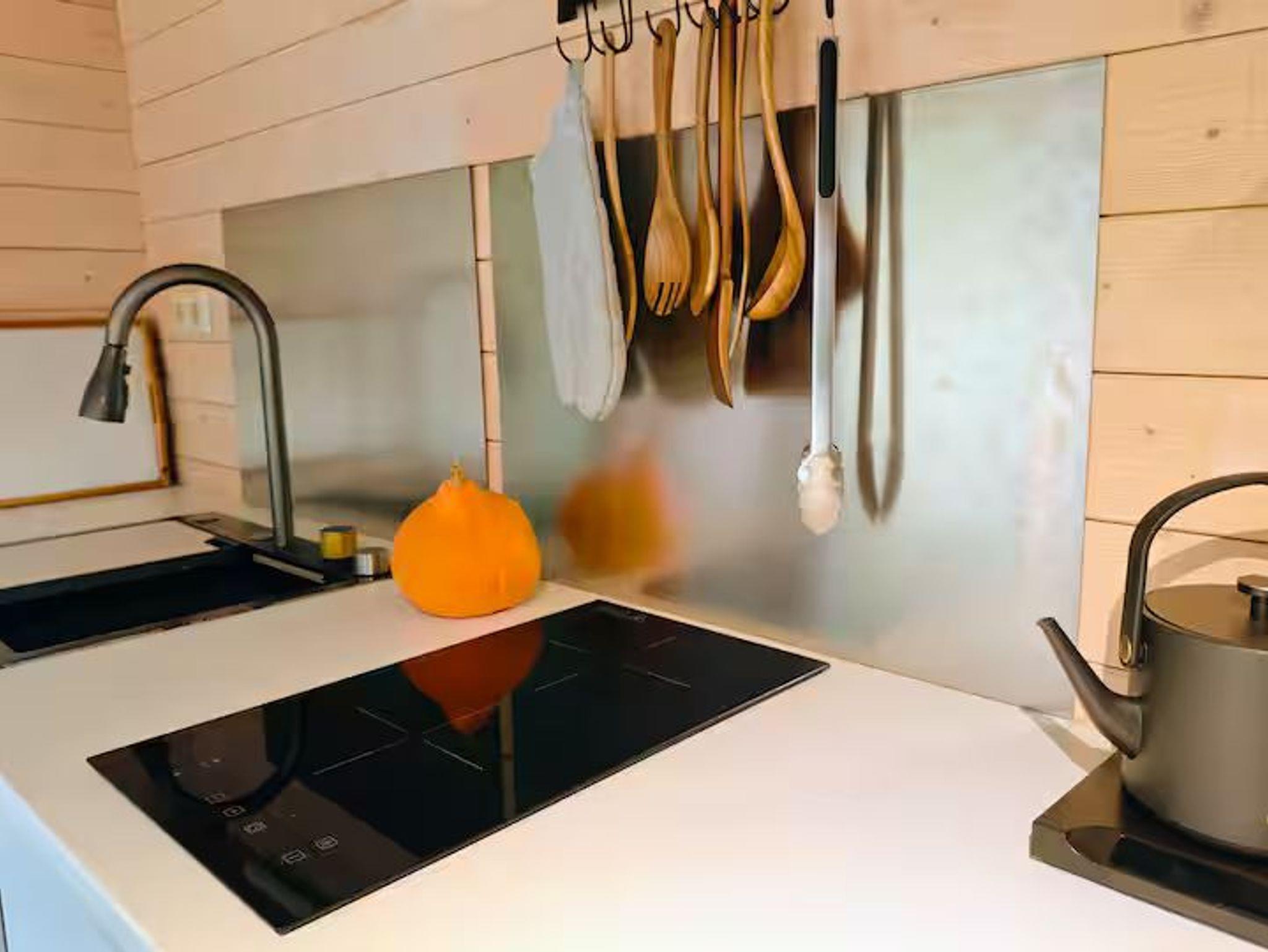 Die Küche ist vollständig eingerichtet, aber nicht sehr groß. Solltet Ihr eine bestimmte Backform, ein weiteres Messer, einen Dörrautomaten für die gesammelten Pilze, ein Waffeleisen oder was auch immer benötigen, bringen wir Euch das gern aus unserem Haushalt.