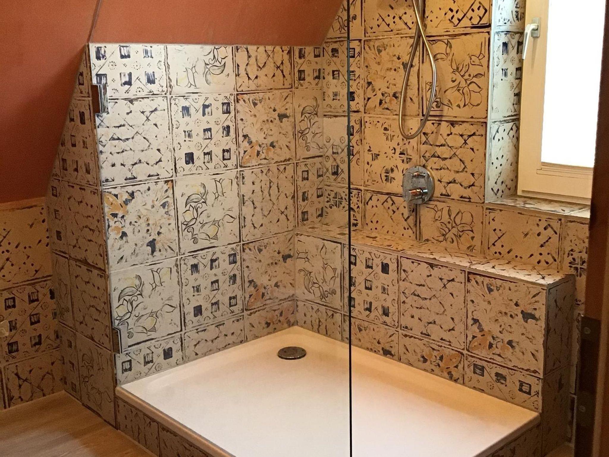 Die Pantryküche ist im Vorflur und hat eine Spüle, einen Kühlschrank, eine Mikrowelle, eine Induktionskochplatte und dem nötigen Kochgeschirr sowie einer Kaffeemaschine. Das Badezimmer ist mit einer Dusche ausgestattet - alles neu und mit hochwertigen Fliesen im mediterranen Stil.