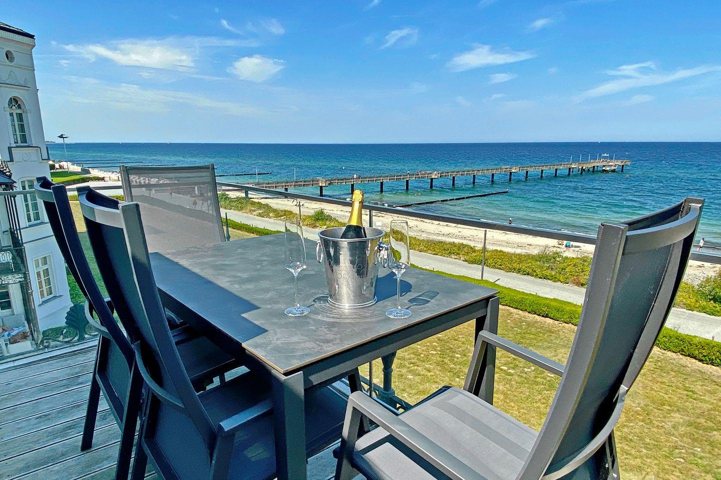 Die 110 m² große Ferienwohnung lässt Sie jeden Alltagsstress vergessen. In dieser luxuriösen Ferienwohnung werden Wohlfühlatmosphäre und eine hochwertige Ausstattung groß geschrieben. Die großzügige 3-Zimmer-Ferienwohnung mit Nord sowie Süd-West-Ausrichtung befindet sich in der zweiten Etage der Villa Greif und bietet bis zu 4 Personen und einem Kleinkind viel Platz für einen fantastischen Urlaub an der Ostsee – direkt am Strand. Die Wohnung ist in einen Wohnbereich, einen Ess- und einen Küchenbereich sowie zwei Schlafzimmern, einem Bad mit Wanne, Dusche und Sauna und einem Gäste-WC aufgeteilt. Auf dem Balkon können Sie entspannte Stunden mit einem wunderschönen Panoramablick auf die Ostsee, die Seebrücke und den Strand genießen.