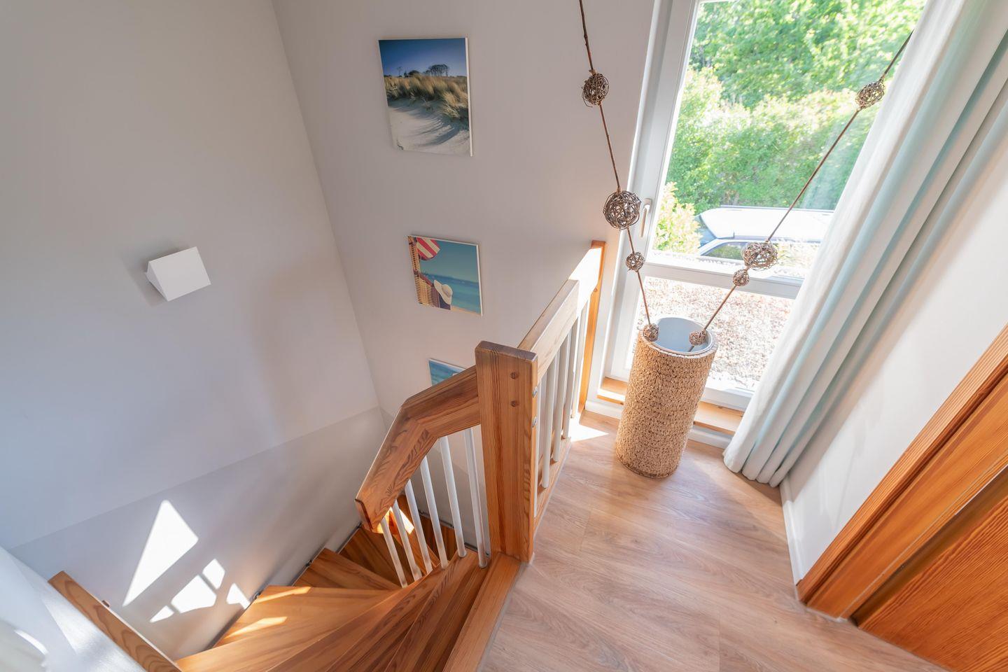 In der oberen Etage befinden sich 2 Schlafzimmer. Das erste Schlafzimmer ist für dich mit einem Boxspringbett (180 x 200 cm) eingerichtet. Ein Kleiderschrank dient als Stauraum für deine Kleidung. Im zweiten Schlafzimmer empfängt dich ein Boxspringbett (140 x 200 cm) zur Nachtruhe. Für dein Urlaubsgepäck ist auch hier eine Kommode vorhanden. Rollos dienen dir hier als Sichtschutz.