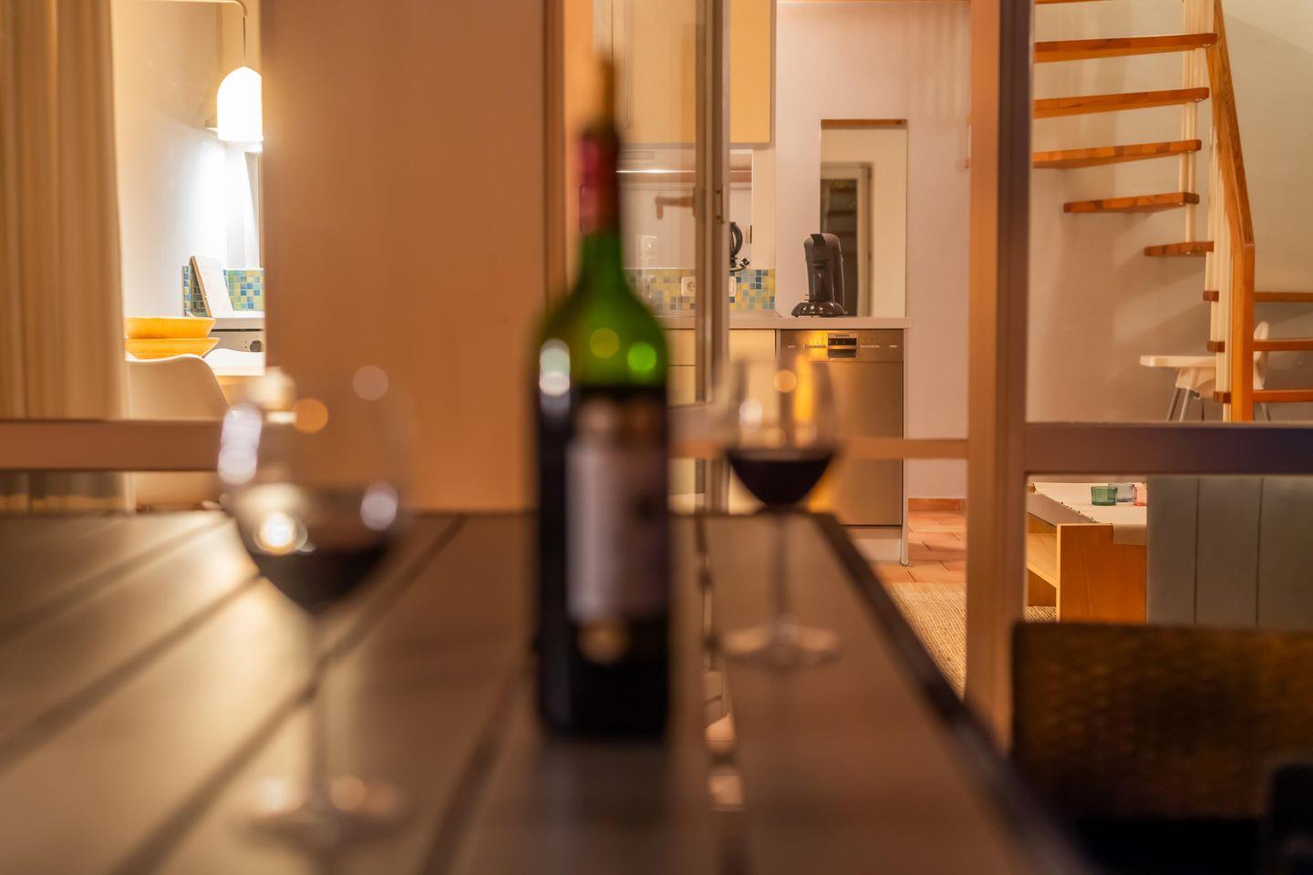 Die Einbauküche ist mit einem Cerankochfeld (4 Kochzonen), einem Backofen, einem Geschirrspüler sowie einem Kühlschrank mit Gefrierfach voll eingerichtet. Ein Toaster, ein Wasserkocher und eine Senseo Kaffeepadmaschine vervollständigen die Küchenausstattung. Für die Kleinen ist ein Kinderhochstuhl sowie ein Babybett vorhanden.