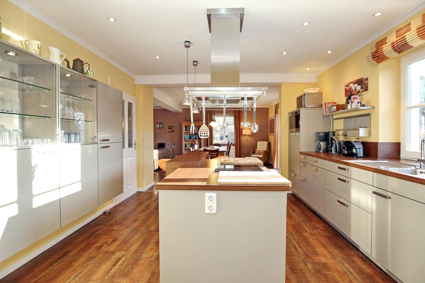 Die hochwertige Küche ist mit einer Kochinsel mit Cerankochfeld (4 Kochzonen), einem Backofen, einem Geschirrspüler, einem Dampfgarer sowie einem Kühlschrank mit Gefrierfach voll eingerichtet. Ein Toaster, ein Wasserkocher und eine Kaffeemaschine komplettieren die Ausstattung.