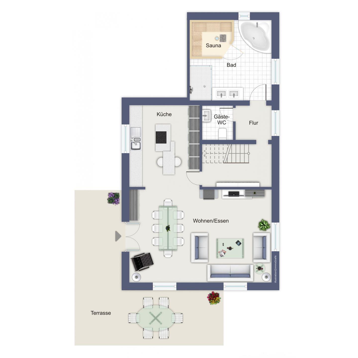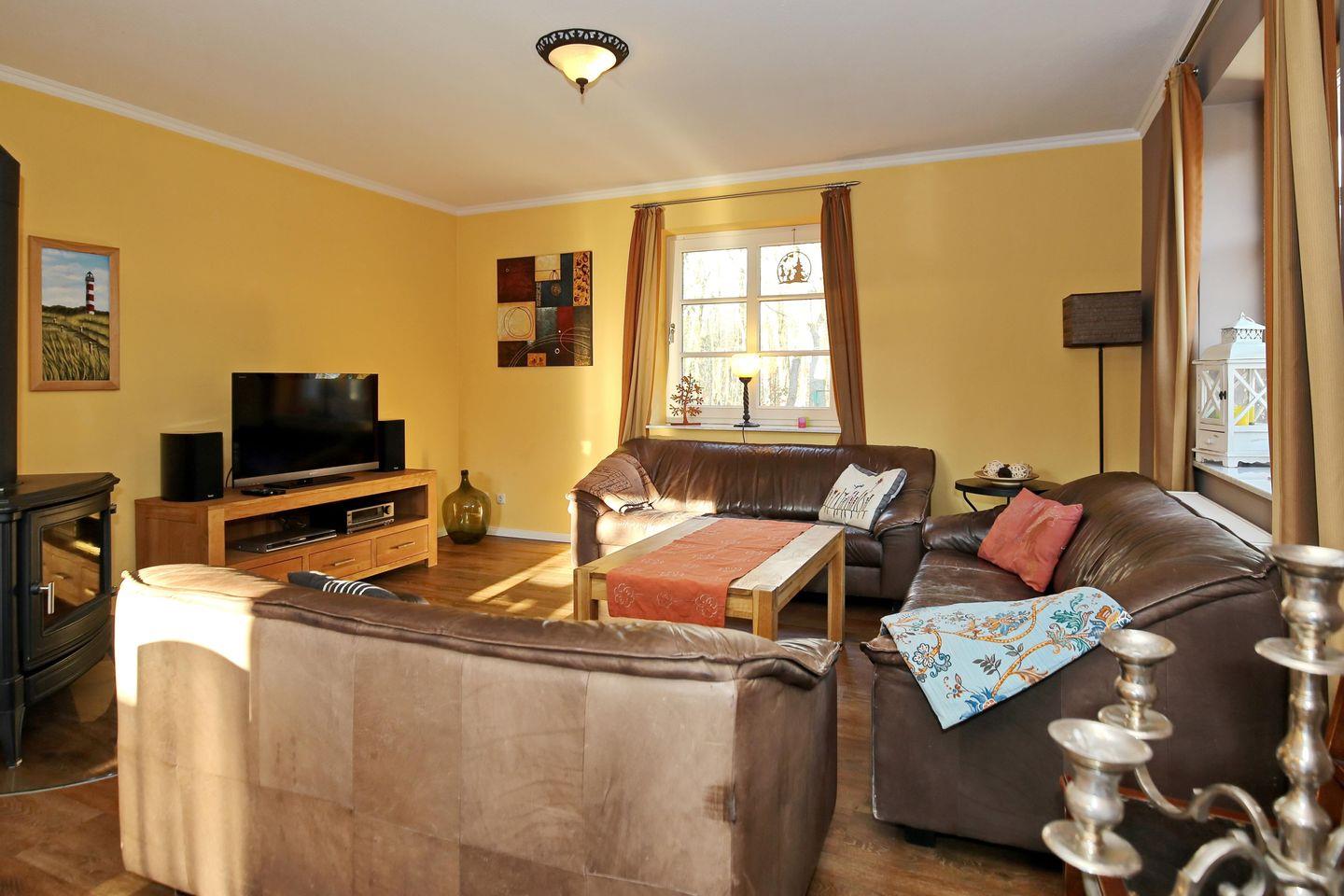 Im offen gestalteten Wohnbereich laden dich drei moderne Sofas und ein Kaminofen zu gemütlichen, gemeinsamen Stunden vor dem Flatscreen-TV ein. Zur weiteren Unterhaltung stehen dir ein Radio sowie ein Blu-Ray-Player zur Verfügung. Der Essbereich mit Blick auf die Terrasse ist im großzügigen Wohnbereich integriert und bietet dir viel Platz für gemeinsame Mahlzeiten.