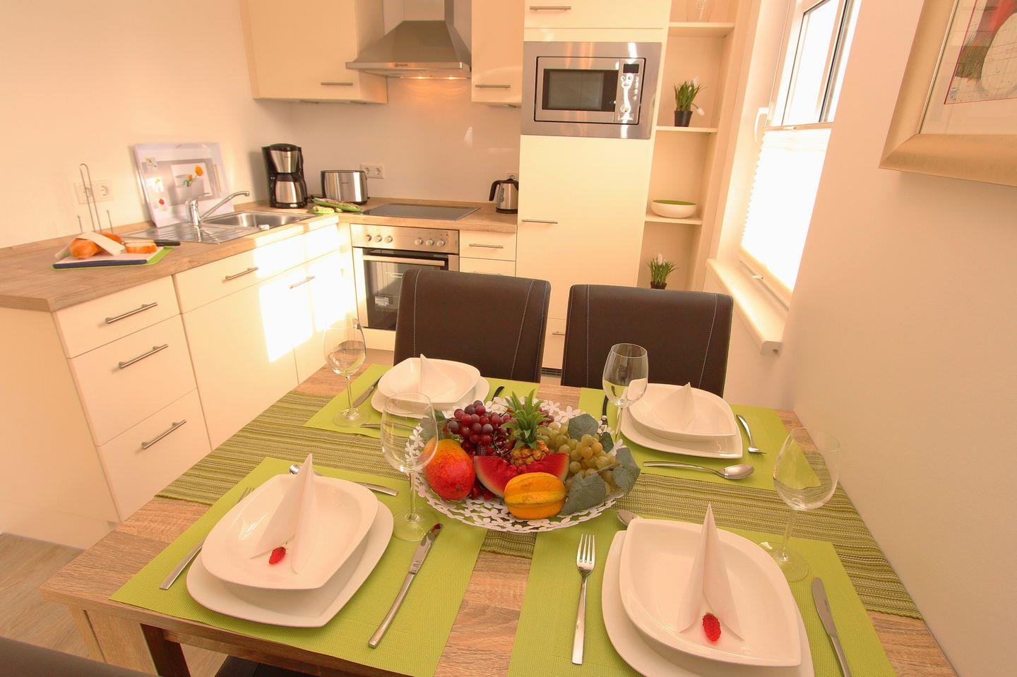 Der Essbereich ist mit einem großen stabilen Tisch und 4 Stühlen ausgestattet. Die exklusive Küchenzeile bietet alles, was du brauchst: ein Cerankochfeld (4 Platten), einen Backofen, eine Mikrowelle, einen Geschirrspüler und einen Kühlschrank mit Gefrierfach.