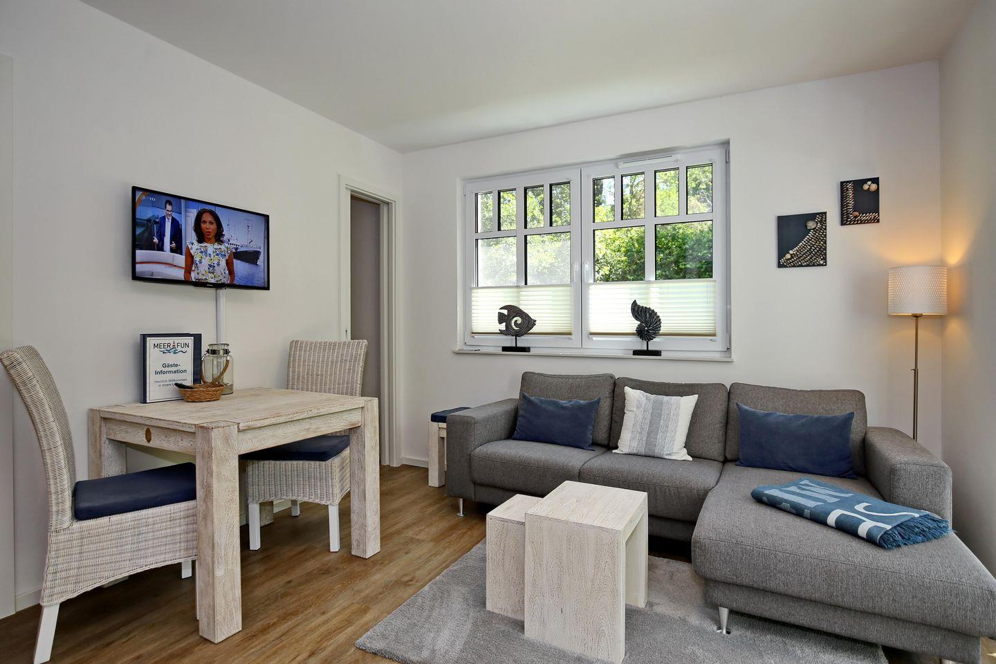 Die 37 m² große 2-Zimmer-Wohnung befindet sich im Erdgeschoss des Hauses. Die möblierte Süd-Terrasse lädt zu erholsamen Stunden im Freien ein. Die Ferienwohnung bietet mit einem Wohn- und Essbereich, einer Küchenzeile, einem Schlafzimmer und einem Duschbad bis zu 3 Personen Platz für einen schönen Ostseeurlaub. Bis zum Strand sind es nur circa 50 Meter.