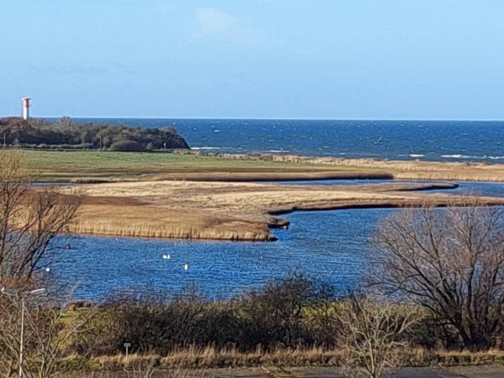 Lamps on the walls, WLAN, heating, games collection, books, large window front with pleated blind and view of the Baltic Sea and nature reserve, table and 2 leather armchairs, exit balcony.