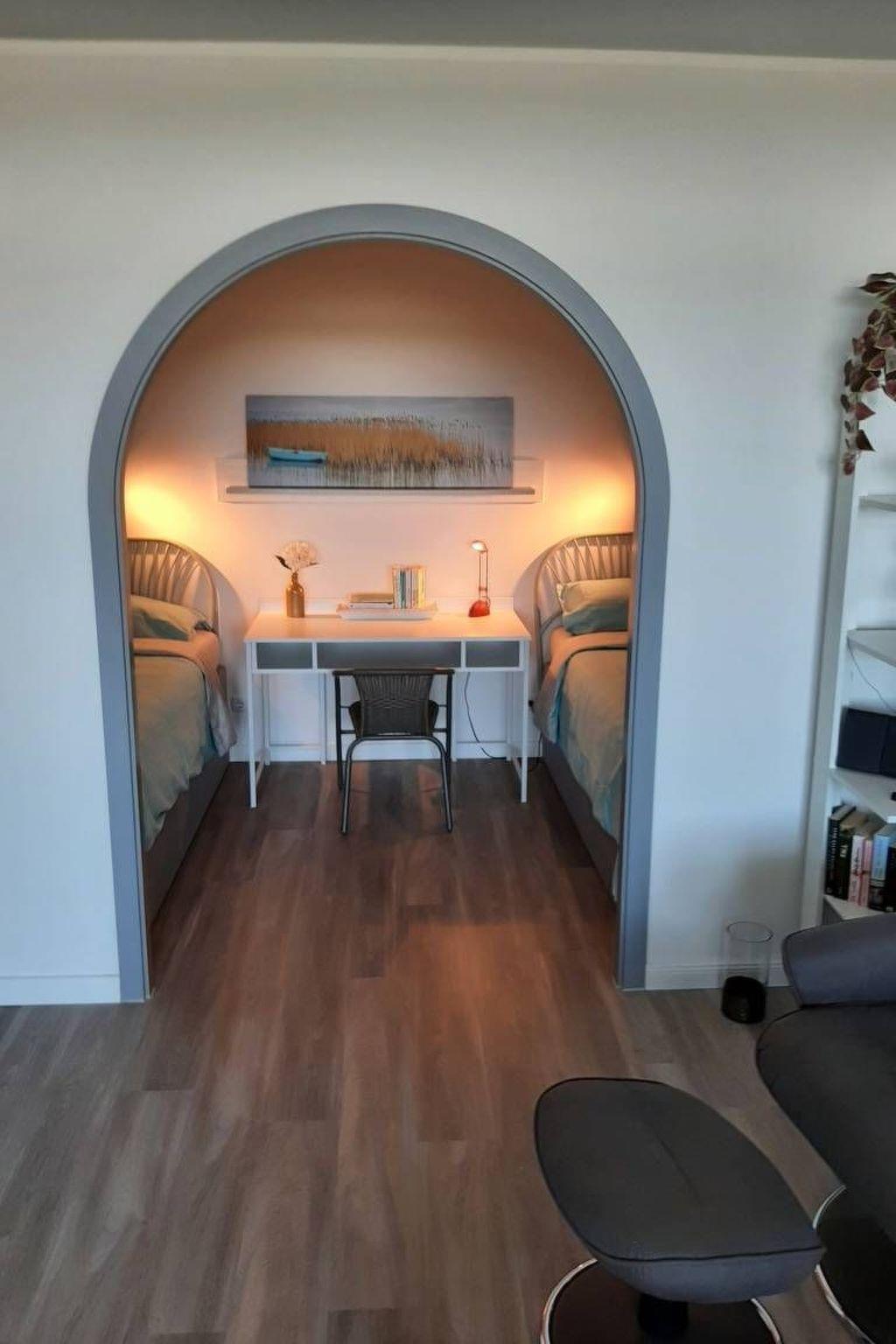 The bedroom is separated by a round arch with blackout option. 2 box-spring beds 200 x 90 cm and a desk with chair, wall shelf, reading lamps above the beds and on the desk.
