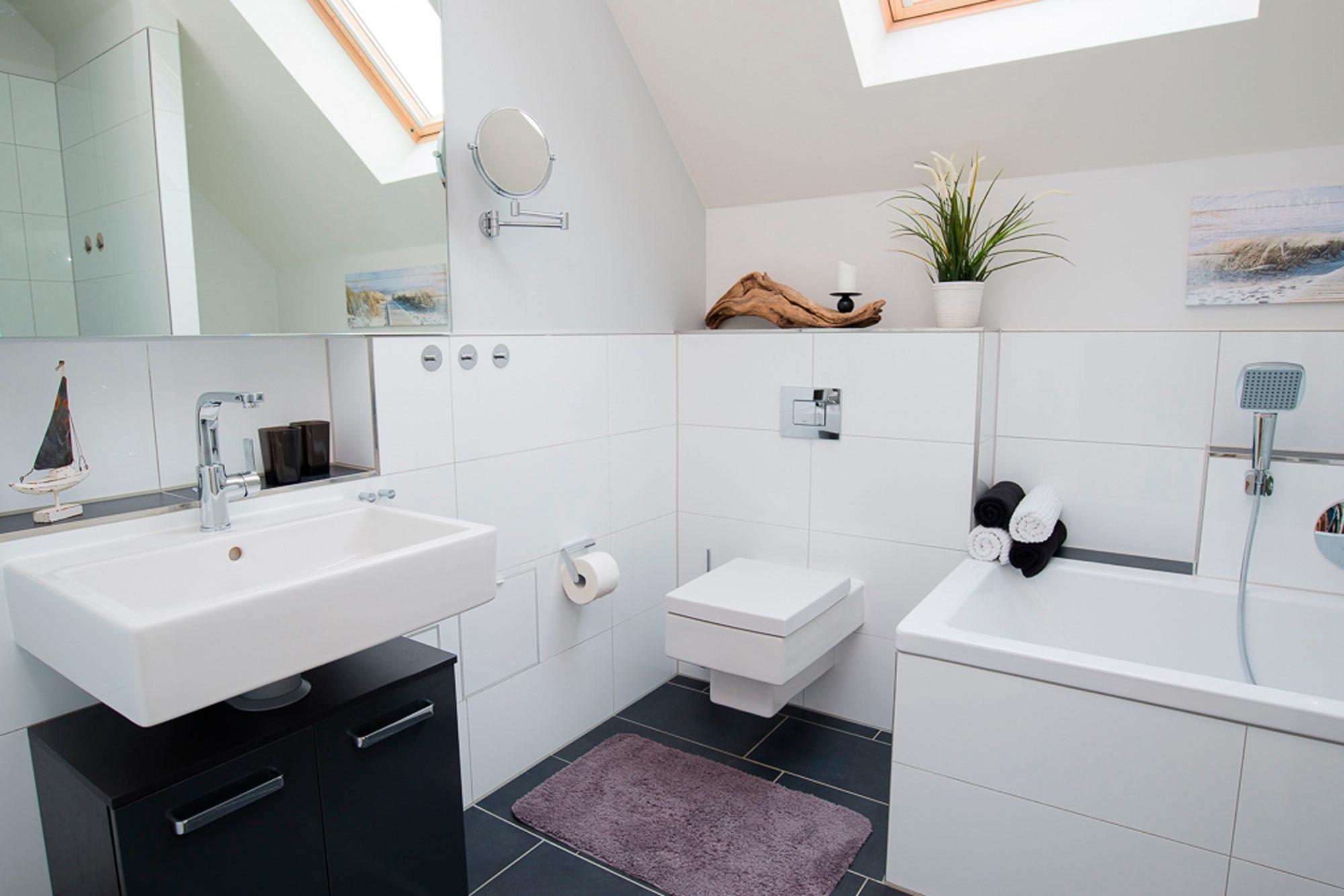 Das Badezimmer im Obergeschoss wurde mit einer Wanne ausgestattet, auch hier wurde eine Dusche in einer Breite von 0,90m eingebaut.