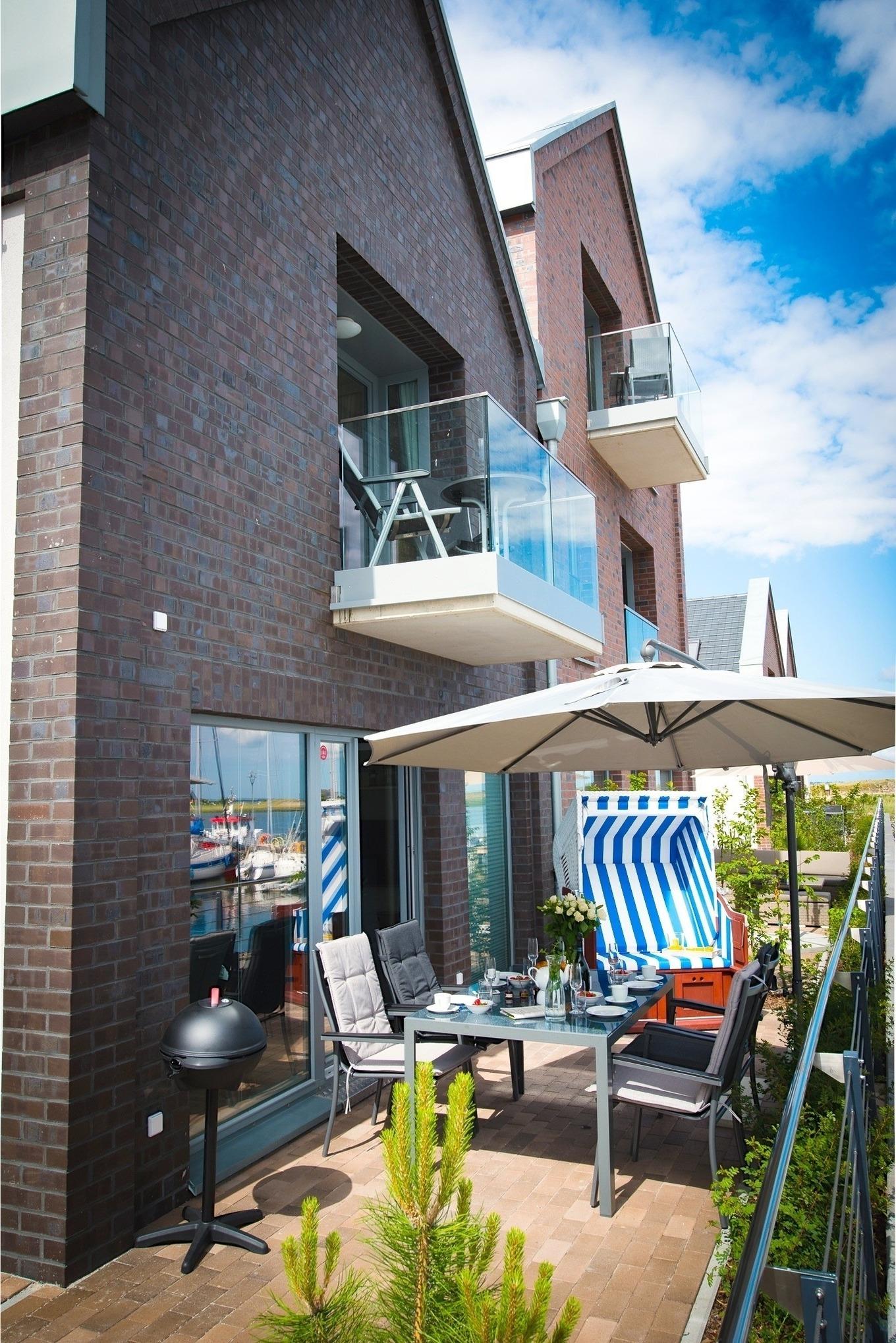 Vom Wohnzimmer und über einer extra breiten Stulptür gelangen Sie auf die Terrasse. In den Sommermonaten lädt diese mit bequemen Gartenmöbeln, Grillmöglichkeiten und einem Strandkorb zum Aufenthalt ein.