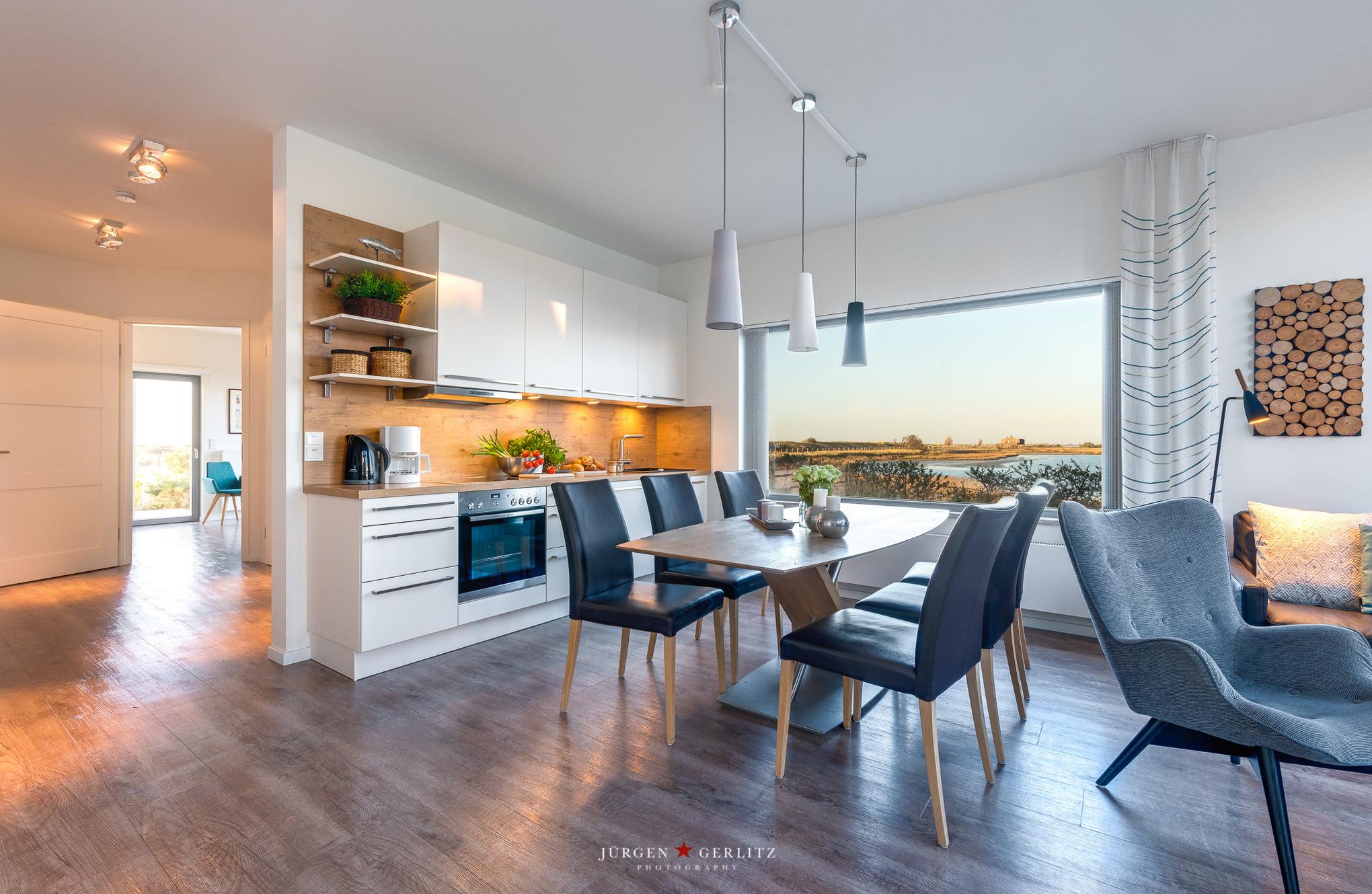Im Eingangsbereich erwartet den Gast eine geräumige Diele mit praktischen Sitz- und Ablagemöglichkeiten. Rechts gelangt man in den großen, lichtdurchfluteten Wohn- und Essraum mit komfortabler, komplett ausgestatteter Küchenzeile. Am großzügigen Esstisch wird alles zu einem besonderen Genuss: direkt am breiten Panoramafenster gelegen hat man einen einzigartigen Blick auf das Ostseewasser und Graswarder. Von der gemütlichen Sofaecke mit Kaminofen und Sessel kann man durch die raumhohe Fensterfront das maritime Treiben im Yachthafen beobachten oder in anderer Form Entspannung finden (z.B. TV/Blue-Ray-Player/HiFi-Anlage). Auf der großen Süd-Terrasse mit bequemen Sitzmöbeln und Grillmöglichkeit lässt es sich ebenfalls stundenlang aushalten, um Ausblick, Sonne und Wasser zu genießen oder sich einfach nur die Meeresbrise um die Nase wehen zu lassen. Und nicht nur das: Eine traumhafte Rückzugsmöglichkeit und einen echten Hingucker bietet der schicke Strandkorb an der Ostseite des Hauses, mitten im Dünensand gelegen. Hier ist man ganz für sich, davor nur Himmel, Wasser und Natur... das ist Urlaubsfeeling pur!