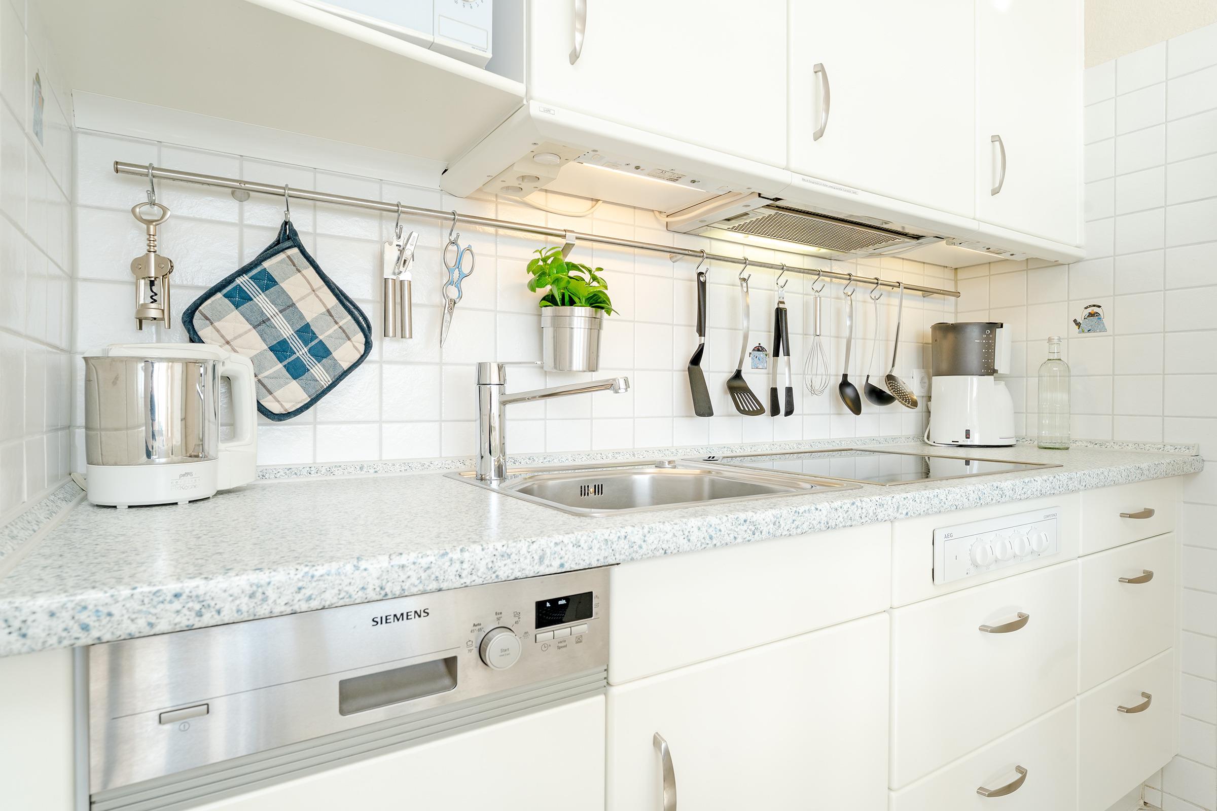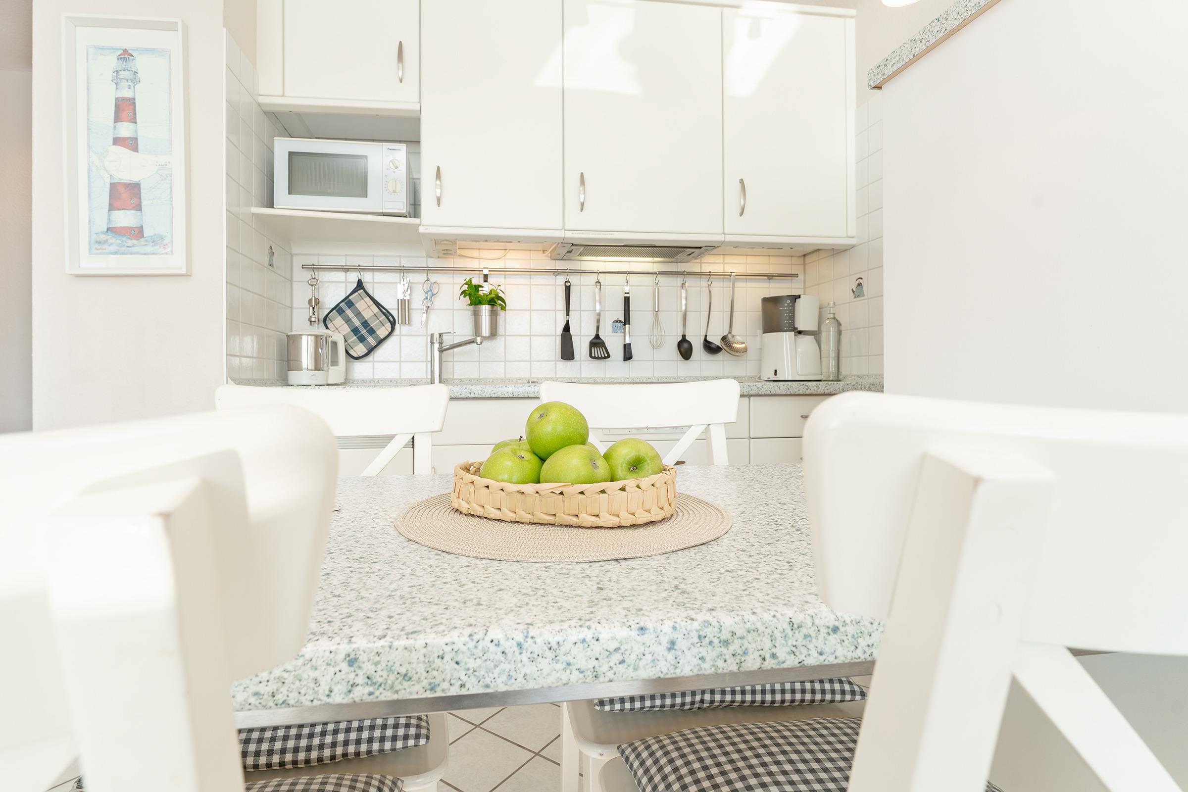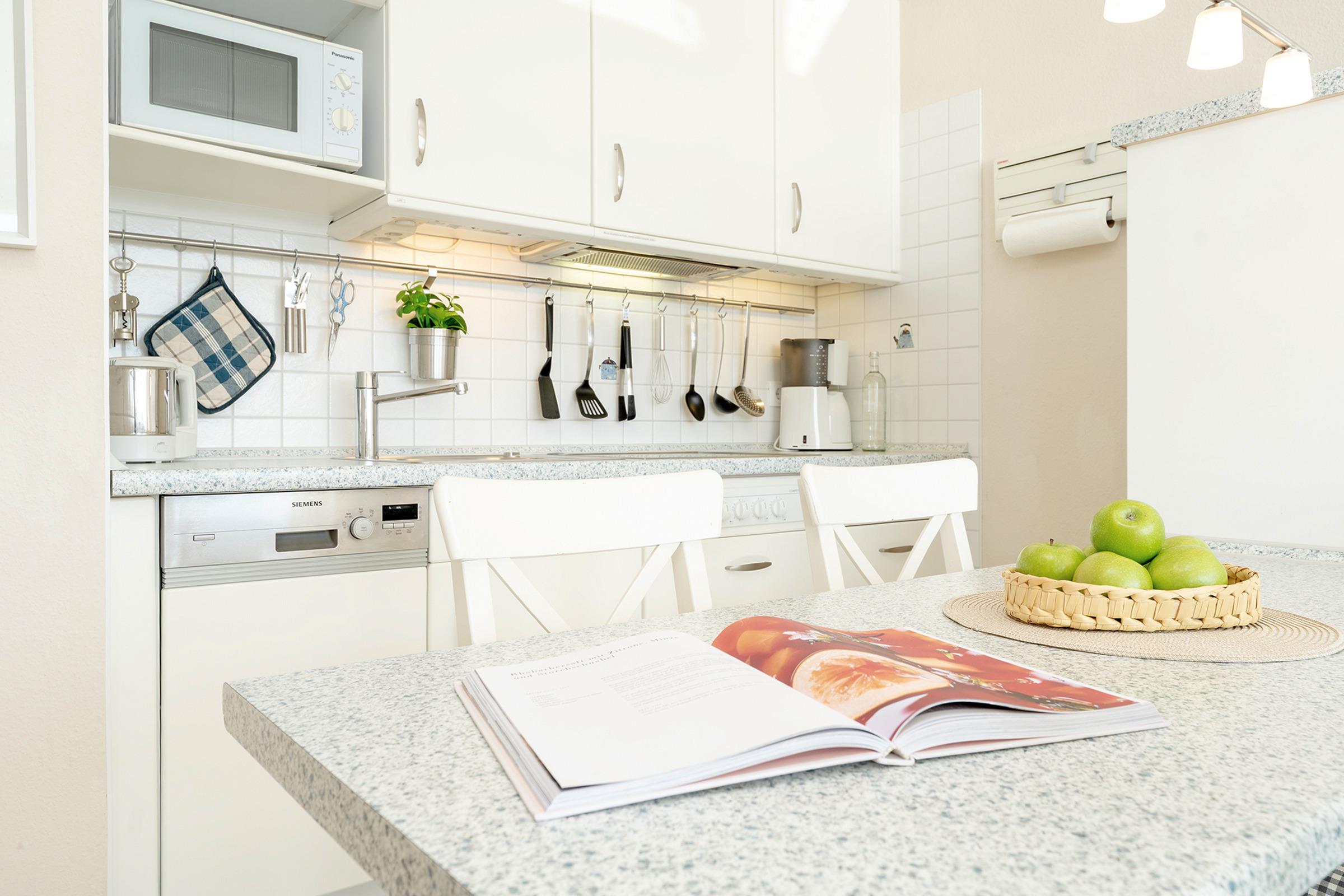 Die angrenzende Küche ist mit Cerankochfeld, Spülmaschine, Mikrowelle, Kaffeemaschine und Toaster ausgestattet. Der Essbereich lädt zu gemeinsamen Mahlzeiten ein.