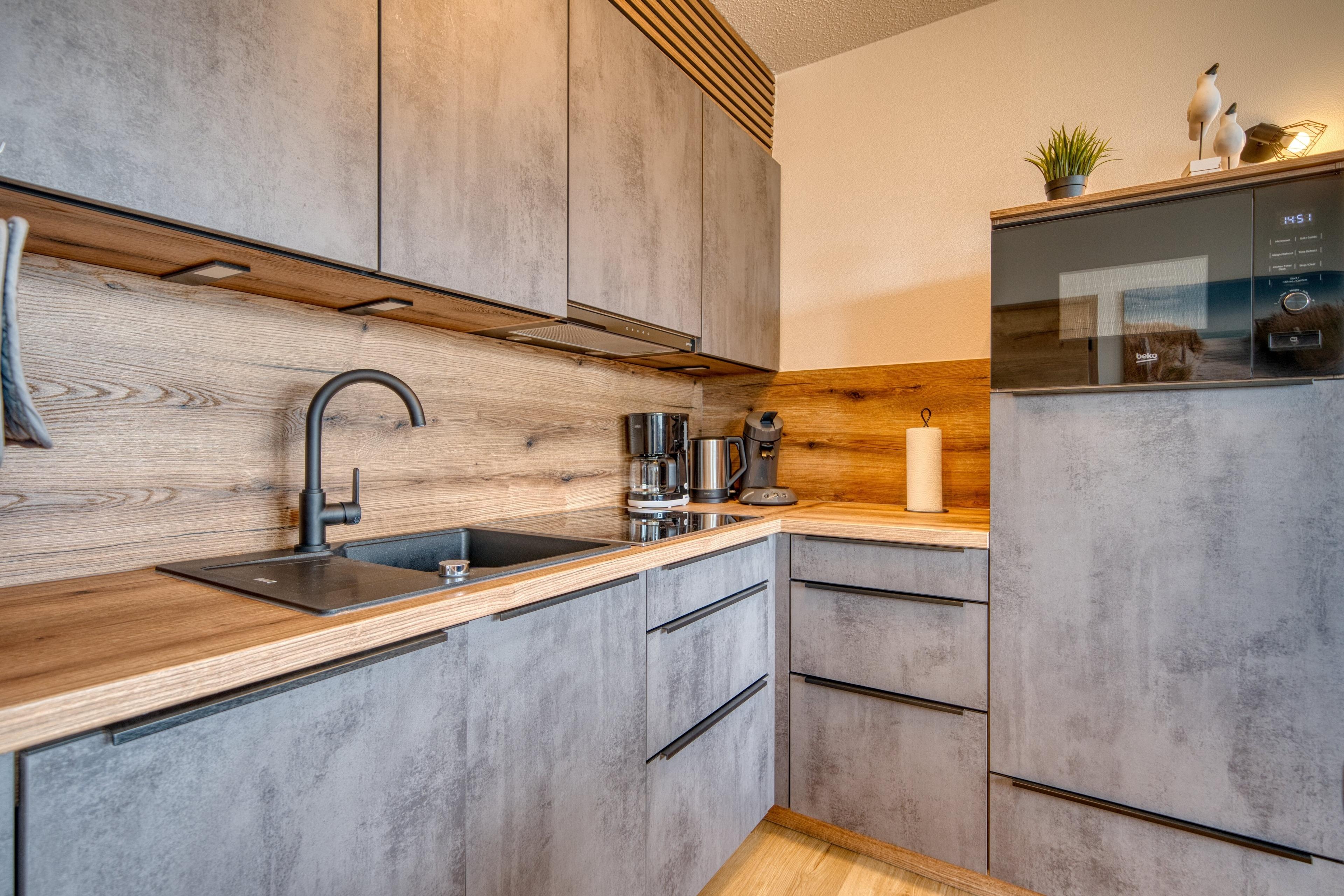 Küche: Geschirrspüler, Kühlschrank mit Gefrierfach, Mikrowelle, Wasserkocher, Toaster, Filterkaffeemaschinen, Induktionskochfeld