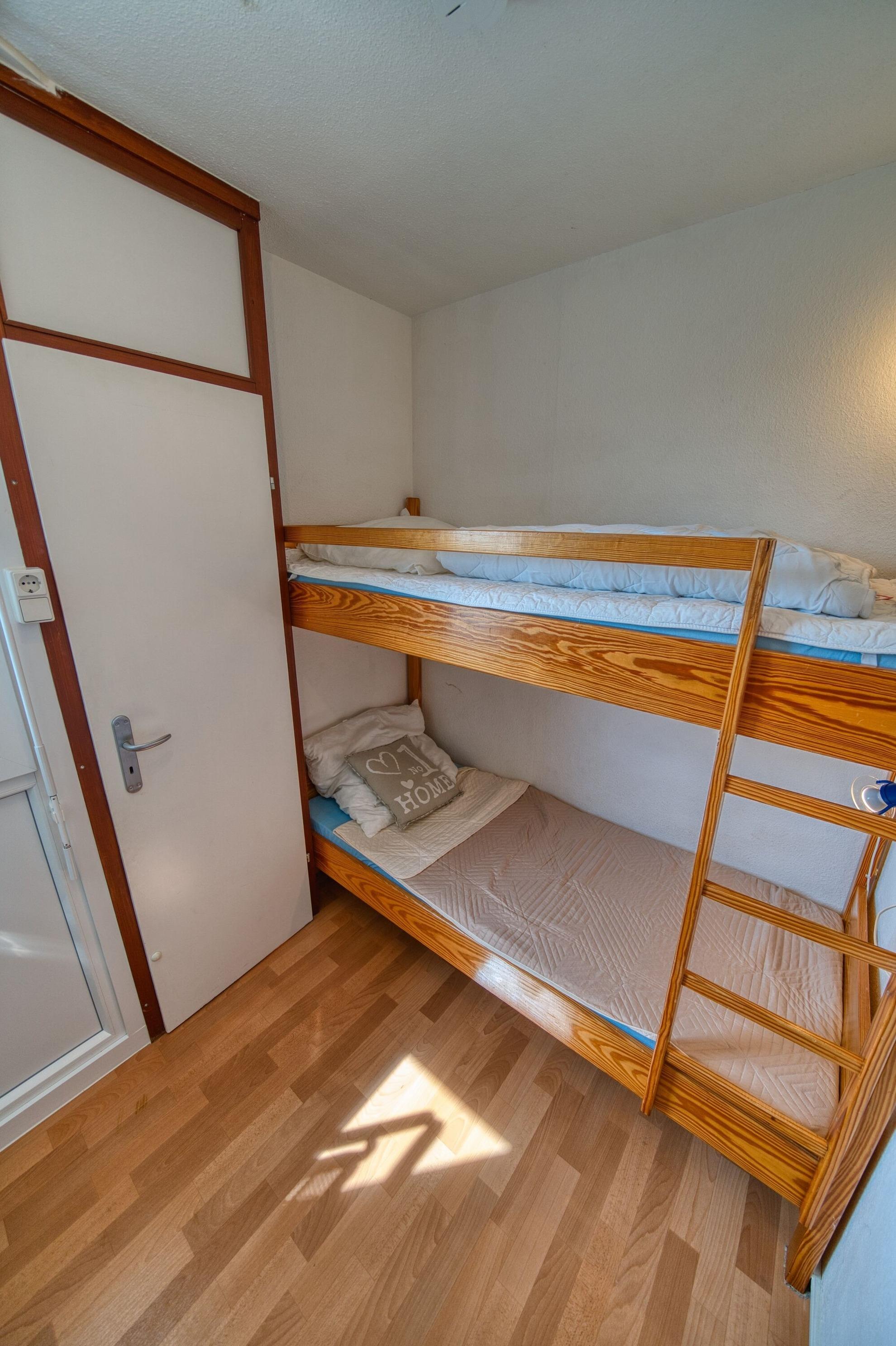 Der Wohn-Schlafbereich ist mit Doppelbett, Smart-TV und Laminatboden ausgestattet. Ein separates Kinderzimmer mit Etagenbett bietet zusätzlichen Komfort. WLAN steht zur Verfügung.