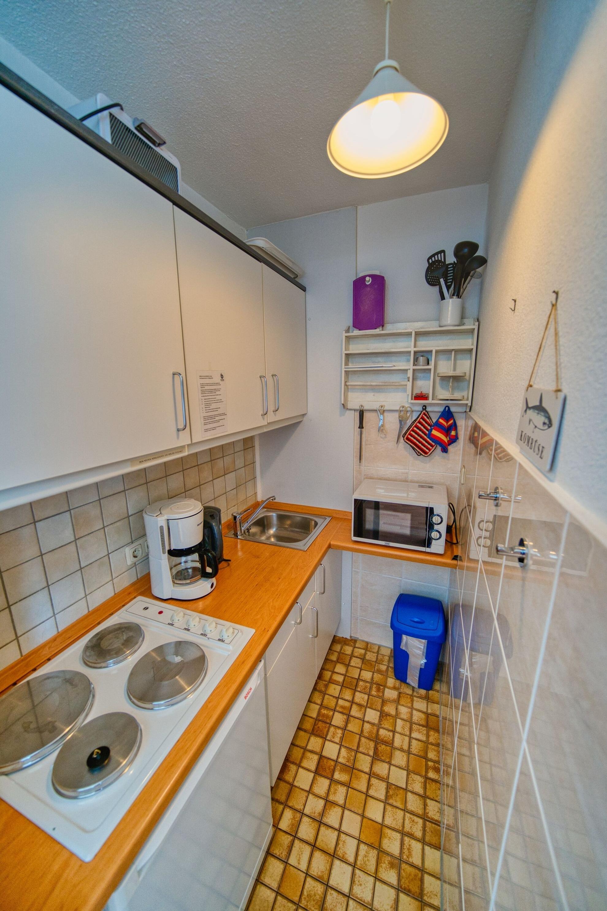Die Küchenzeile verfügt über Ceranherd, Mikrowelle, Kühlschrank mit Gefrierfach sowie Kaffeemaschine, Toaster und Wasserkocher. Das moderne Bad ist mit Duschkabine und Handtuchtrockner ausgestattet.