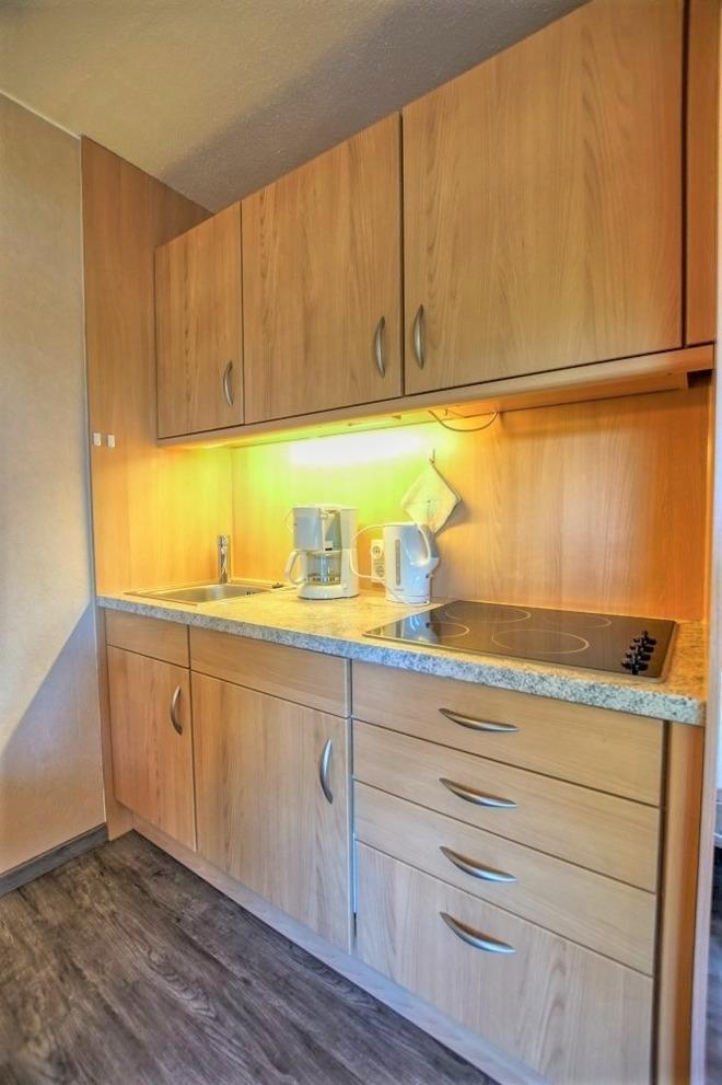 Die Unterkunft verfügt über einen Wohn-/Schlafbereich mit praktischem Schrankbett, Flachbild-TV und Laminatboden. Die offene Küche ist voll ausgestattet mit Ceran-Kochfeld, Kühlschrank, Kaffeemaschine und Wasserkocher. Das Badezimmer bietet Dusche und WC.