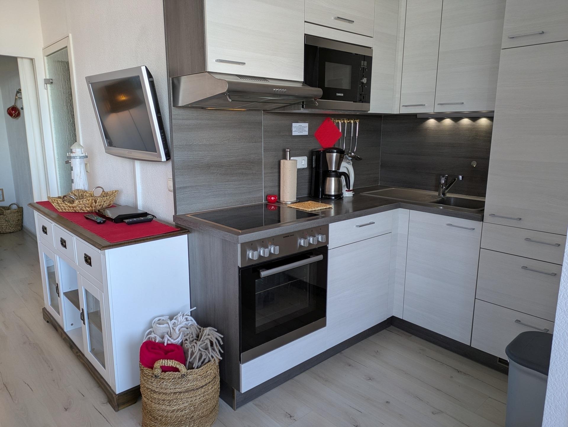 Elternschlafbereich mit Doppelbett und TV, separates Schlafzimmer mit Etagenbett, Wohnbereich mit Essecke und Ostseeblick, Vinylboden. Küche mit Ceranherd, Backofen, Kühlschrank mit Gefrierfach, Geschirrspüler, Filterkaffeemaschine, Mikrowelle, Toaster, Wasserkocher. WLAN inklusive. Ca. 300?m zum Strand, Aktiv-Hus, Shops und Cafés. Nichtraucherwohnung, keine Haustiere, Fahrstuhl, Fahrradräume und Parkplatz vorhanden.