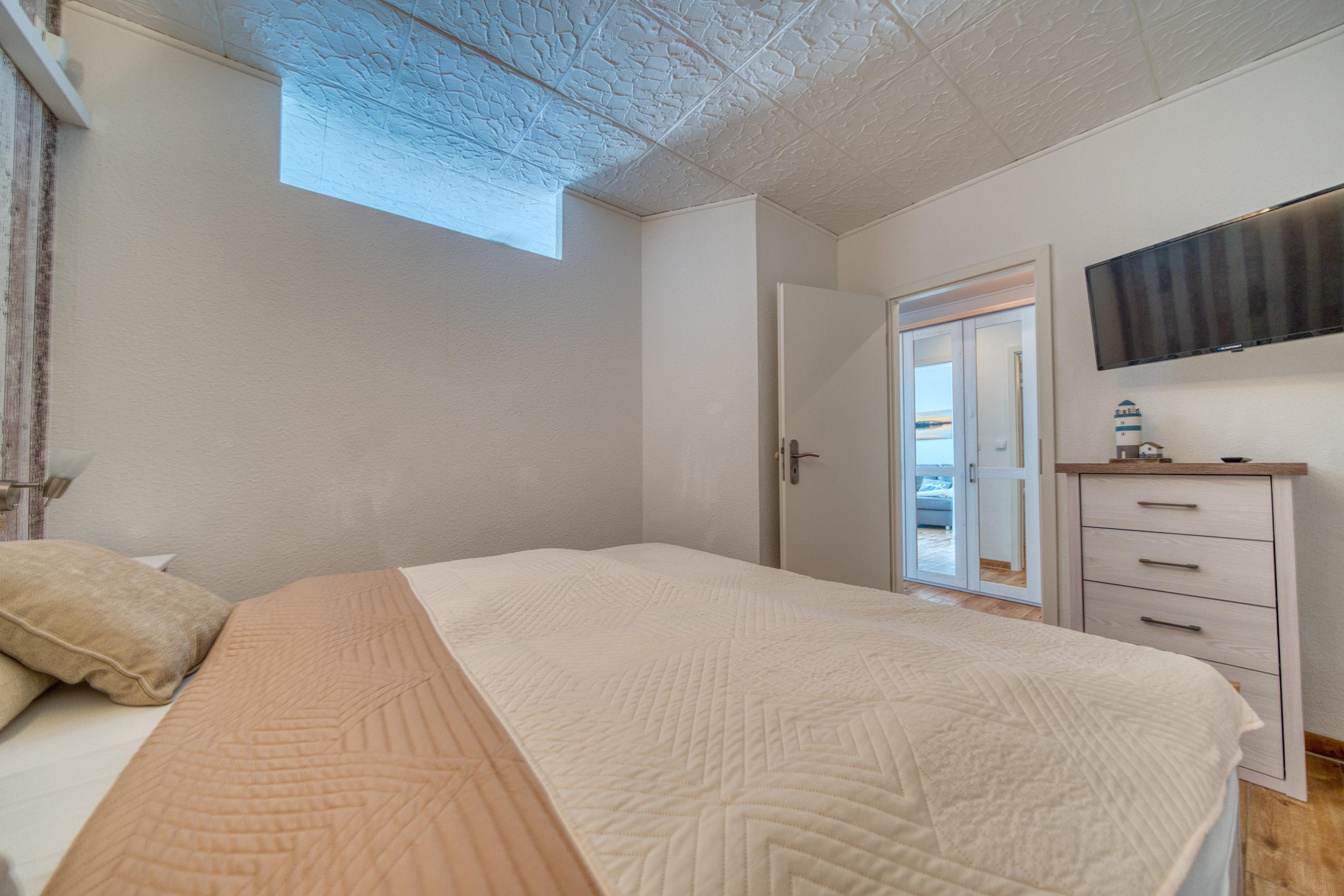 Schlafzimmer mit Doppelbett und TV, weiteres Schlafzimmer mit Einzelbett und TV. Wohnzimmer mit Eckcouch, Esstisch, Smart TV. Voll ausgestattete Küche: Ceranherd, Kühlschrank mit Gefrierfach, Mikrowelle, Kaffeemaschine, Wasserkocher, Toaster. Bad mit Duschkabine und Handtuchtrockner. WLAN inklusive. Ca. 300?m zum Strand, Fahrstuhl, PKW-Stellplatz, abschließbare Fahrradräume. Nichtraucherwohnung, keine Haustiere. Aktiv-Hus, Shops, Gastronomie und Kinderspielwelt „Schatzinsel“ direkt im Ferienpark.