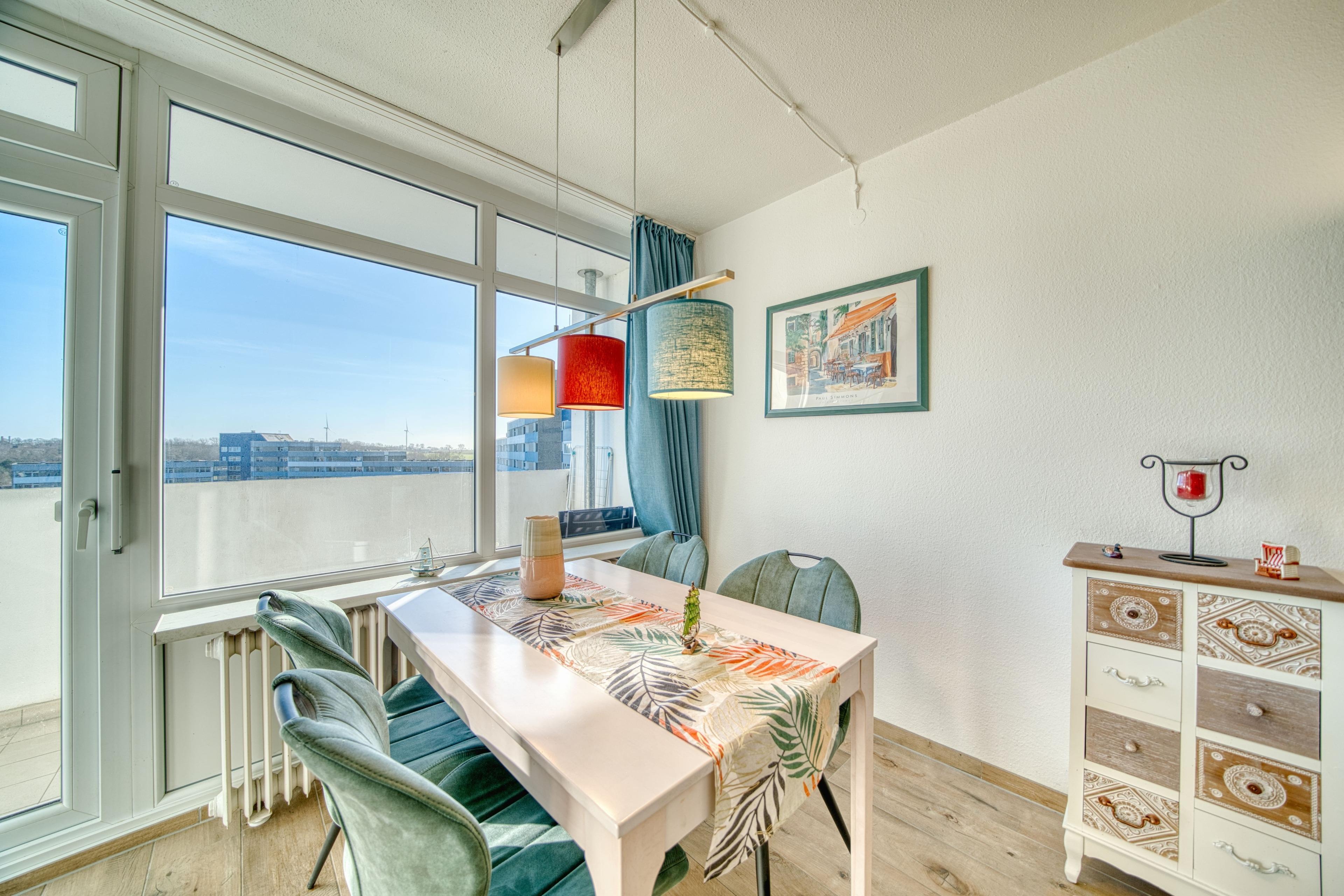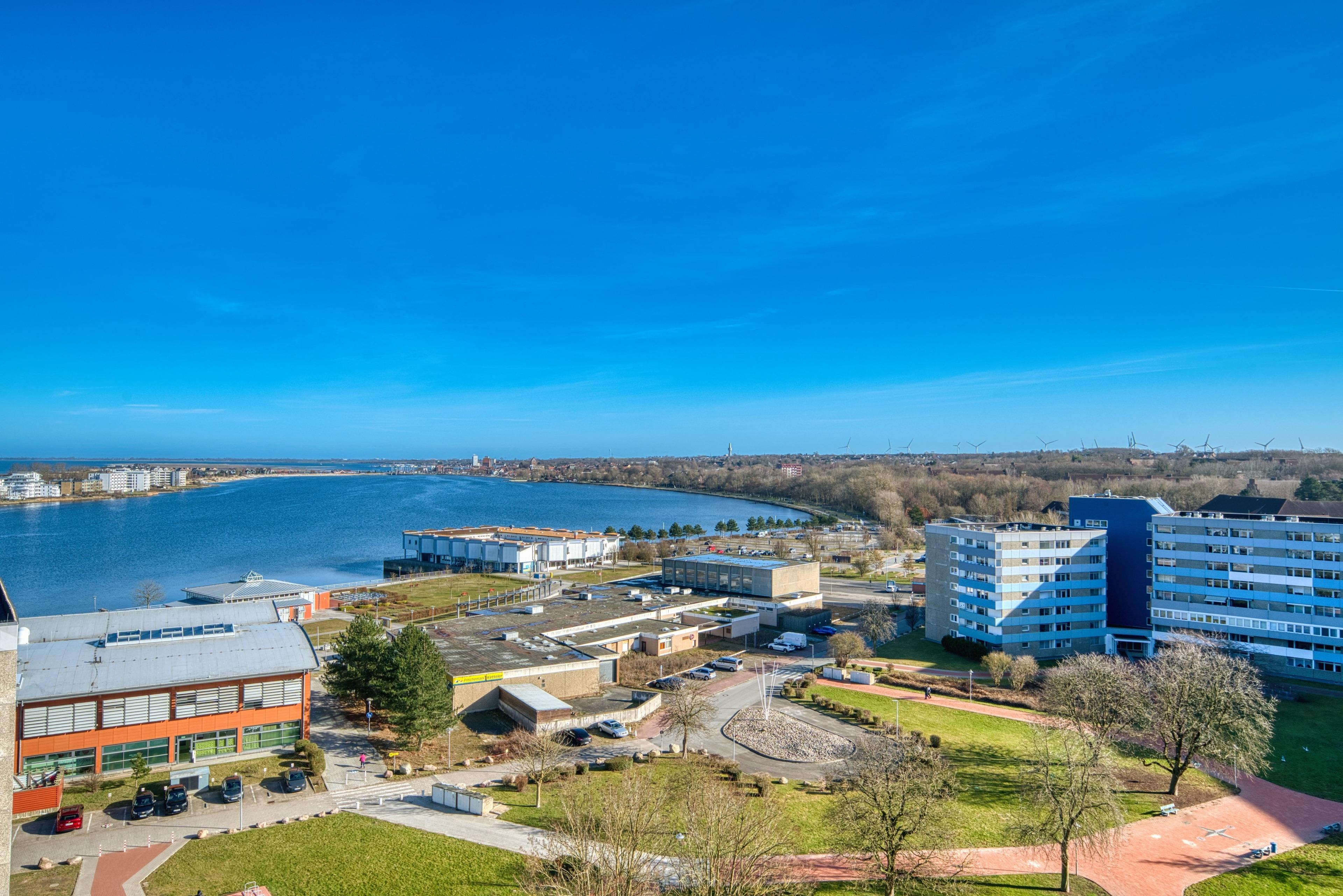 Genießen Sie Ihren Ostseeurlaub in luftiger Höhe! Diese gepflegte Ferienwohnung im 11. Stock des Hauses C im Ferienpark Heiligenhafen bietet auf 45?m² Platz für bis zu 3 Personen. Wohn-/Schlafbereich mit zwei Einzelbetten TV, Sofa und Esstisch. Gästezimmer mit Schlafsofa. Balkon mit Blick auf Innenhof und Binnensee. Küche mit Ceranherd, Kühlschrank mit Gefrierfach, Filterkaffeemaschine, Wasserkocher, Toaster. Bad mit Duschkabine, Handtuchtrockner. WLAN inklusive. Ca. 300?m zum Strand, Fahrstuhl, Parkplatz, Fahrradräume vorhanden. Nichtraucherwohnung, keine Haustiere. Ideal für erholsame Tage und Familienurlaub.