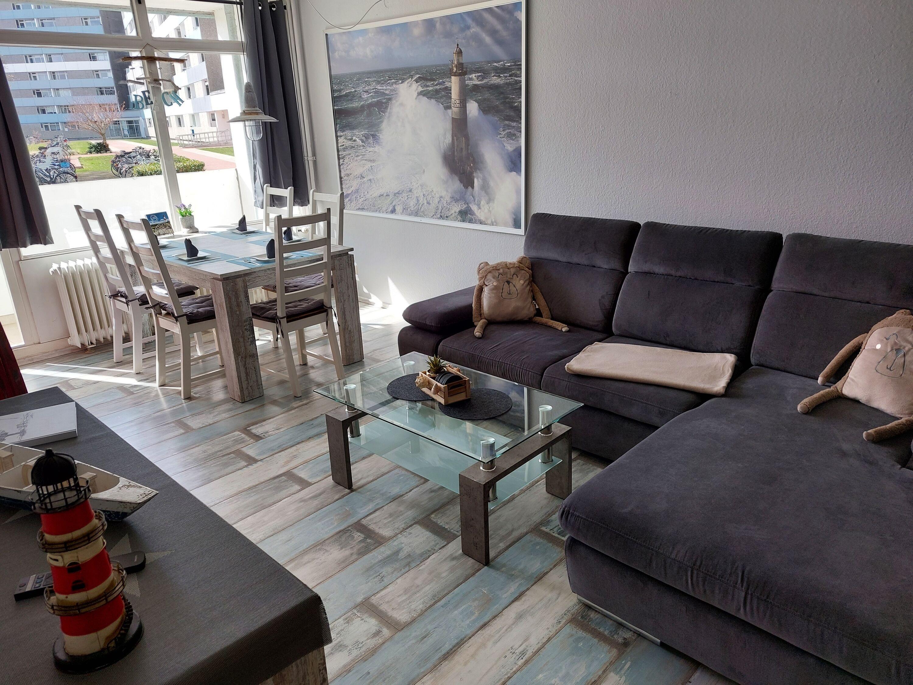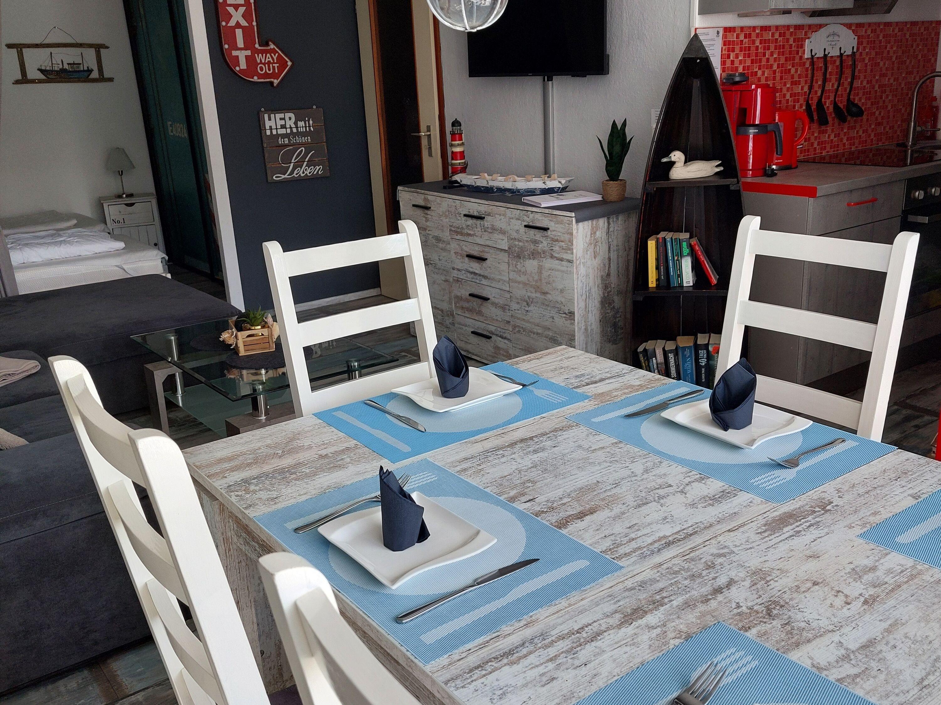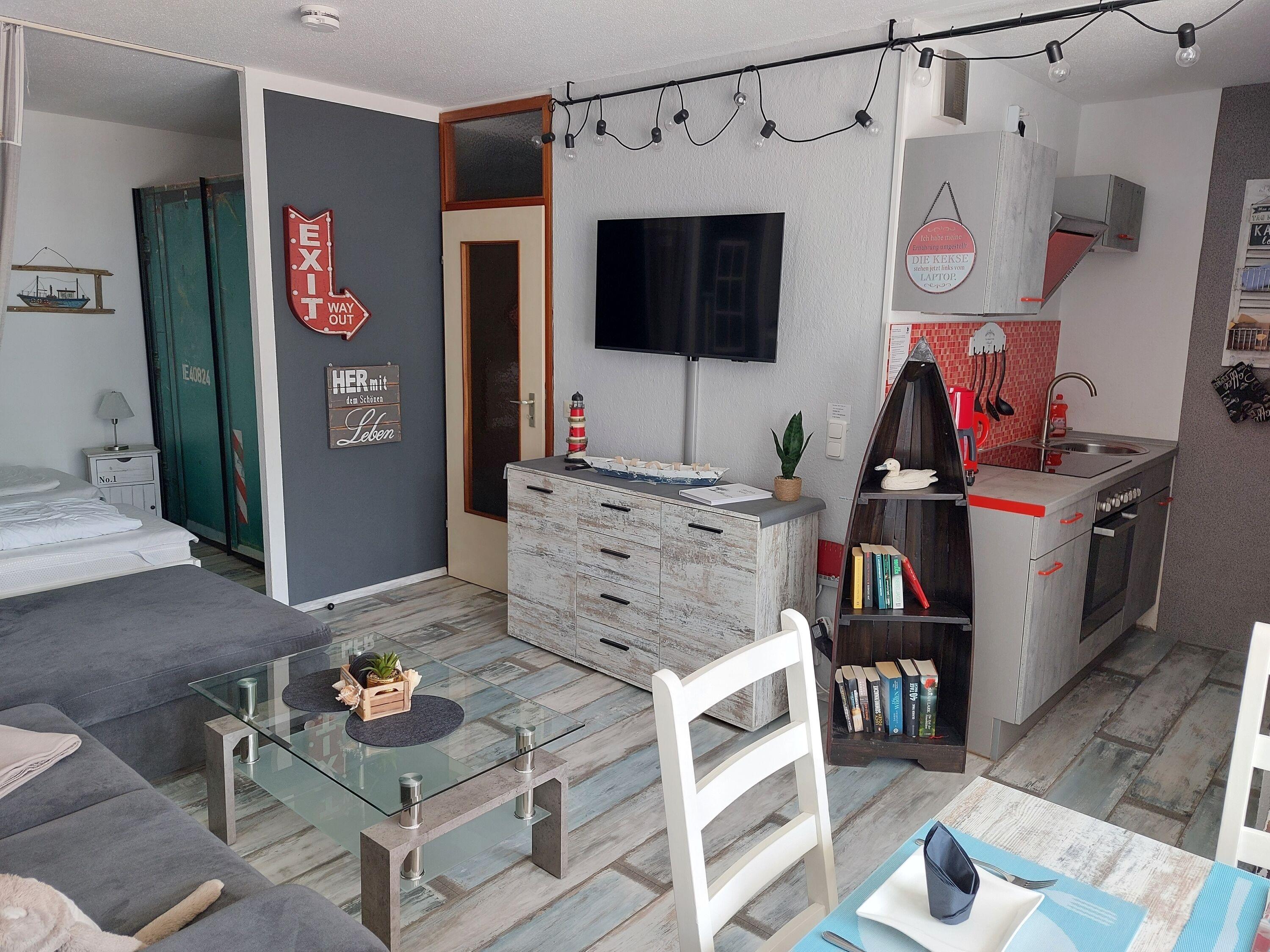 Gemütliche 45?m²-Wohnung für bis zu 5 Personen mit Balkon zum Innenhof. Maritime Einrichtung, Laminatboden im Wohnbereich. Wohn-Schlafbereich mit zwei Einzelbetten und Schlafcouch, Essplatz am Fenster, Flachbild-TV. Separates Kinderzimmer mit Etagenbett. Küche mit Backofen, Cerankochfeld, Kühlschrank mit Gefrierfach und Filterkaffeemaschine. Bad mit WC und Duschkabine. Radfreundlich und familiengeeignet. WLAN inklusive. Kostenloser Parkplatz, abschließbare Fahrradräume. Ca. 300?m zum Strand, Aktiv-Hus mit Schwimmbad, Sauna, Wellness [&] Kinderspielwelt fußläufig erreichbar. Nichtraucherwohnung, keine Haustiere. Perfekt für entspannte Tage an der Ostsee.