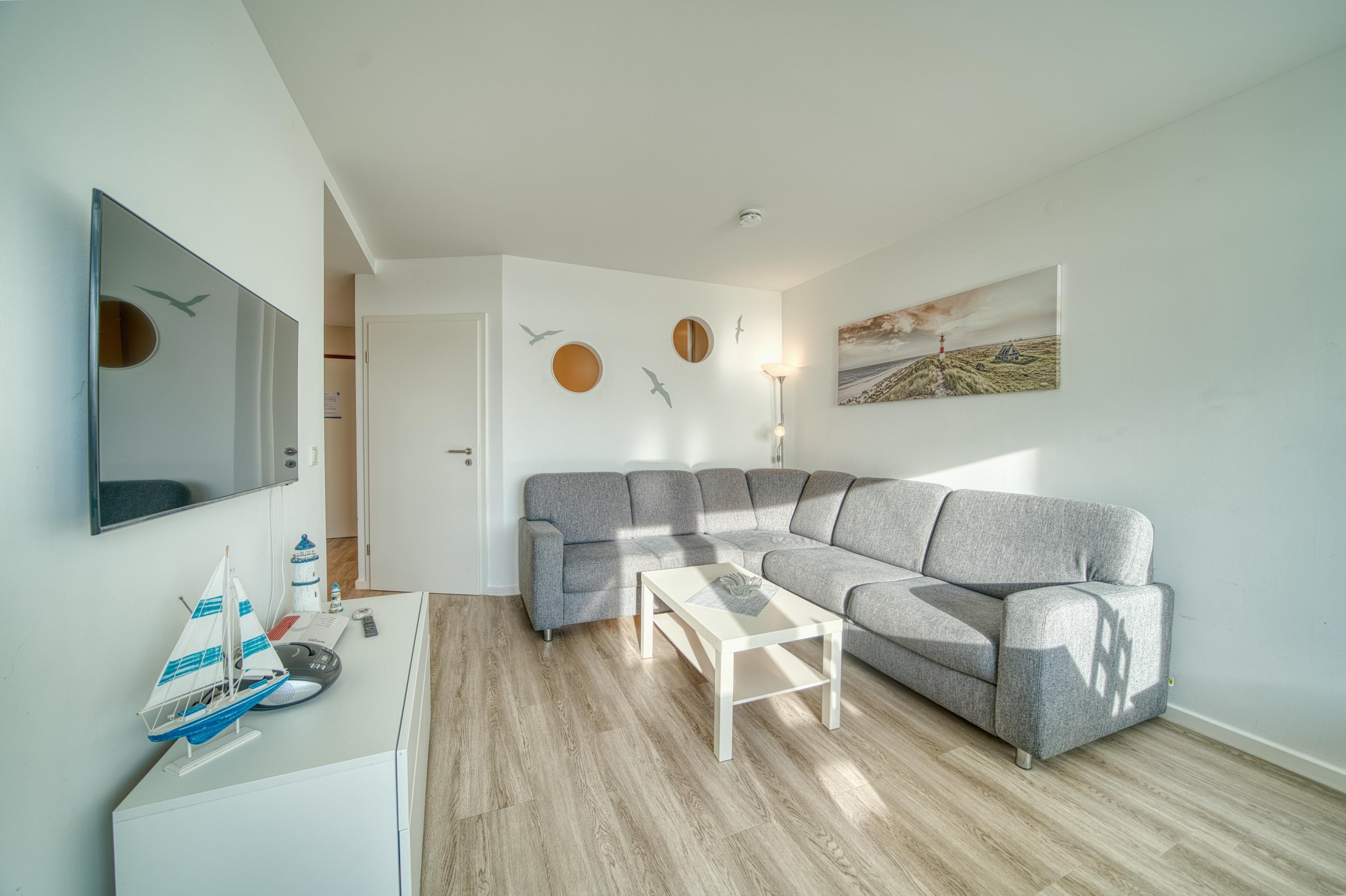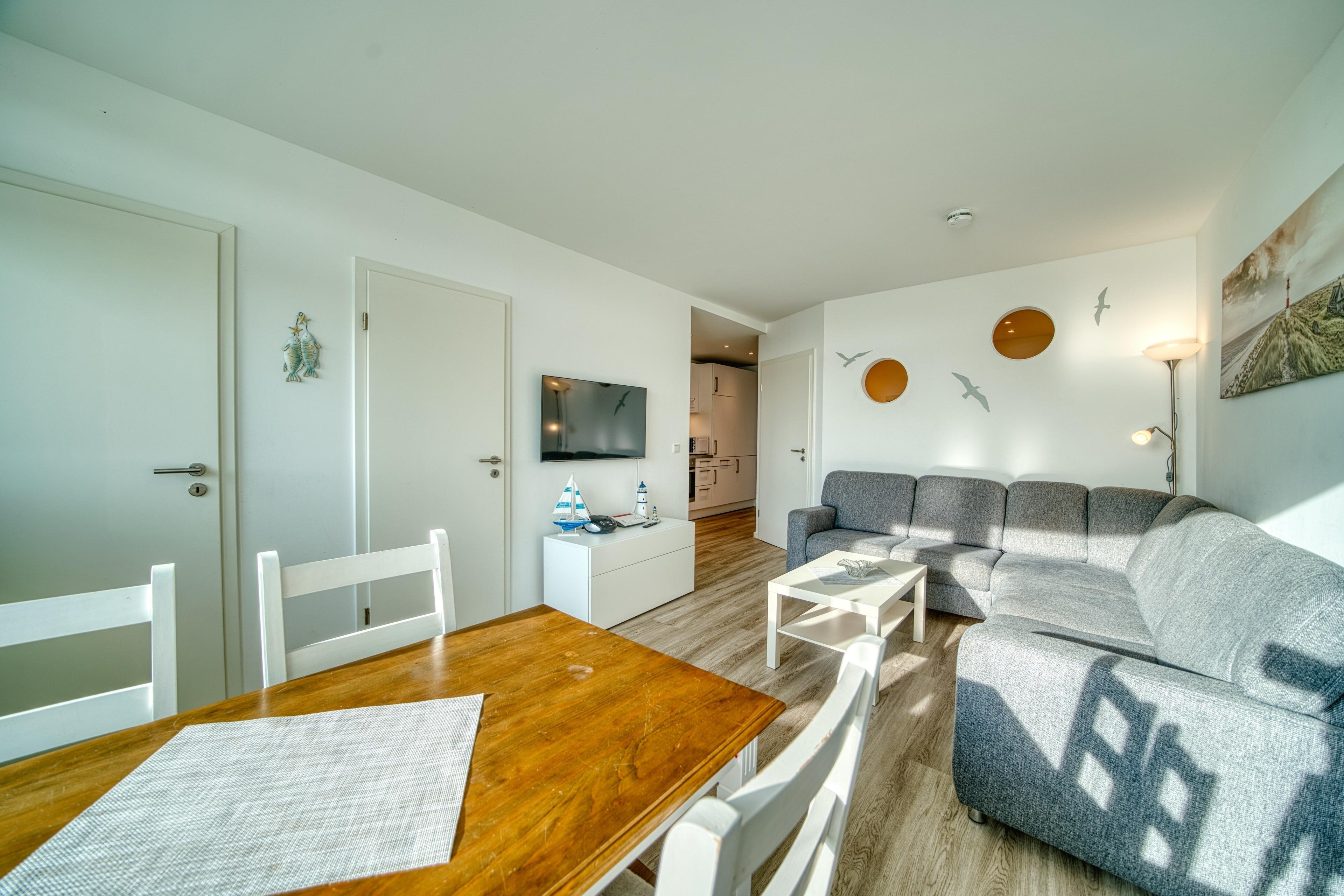 Der Wohn-/Essbereich verfügt über Sofa, Flachbild-TV und Essbereich für 4 Personen. Separater Elternschlafbereich mit Doppelbett und TV sowie Kinderzimmer mit Hochbett für 2 Personen und TV. Die Küche ist komplett ausgestattet mit Ceranfeld, Backofen, Geschirrspüler, Kühlschrank mit Gefrierfach, Kaffeemaschine, Wasserkocher und Geschirr. Das Bad bietet großzügige Dusche und moderne Ausstattung. Kostenloses WLAN vorhanden. Nichtraucherwohnung, keine Haustiere, Parkplatz vorhanden. Der Strand liegt ca. 300?m entfernt, das Aktiv-Hus mit Schwimmbad, Sauna und Wellness ist fußläufig erreichbar.