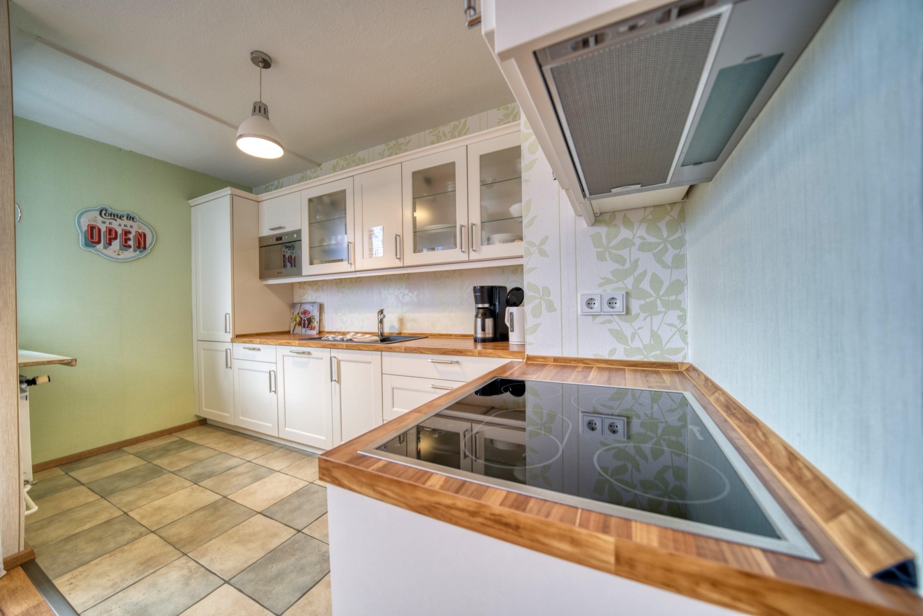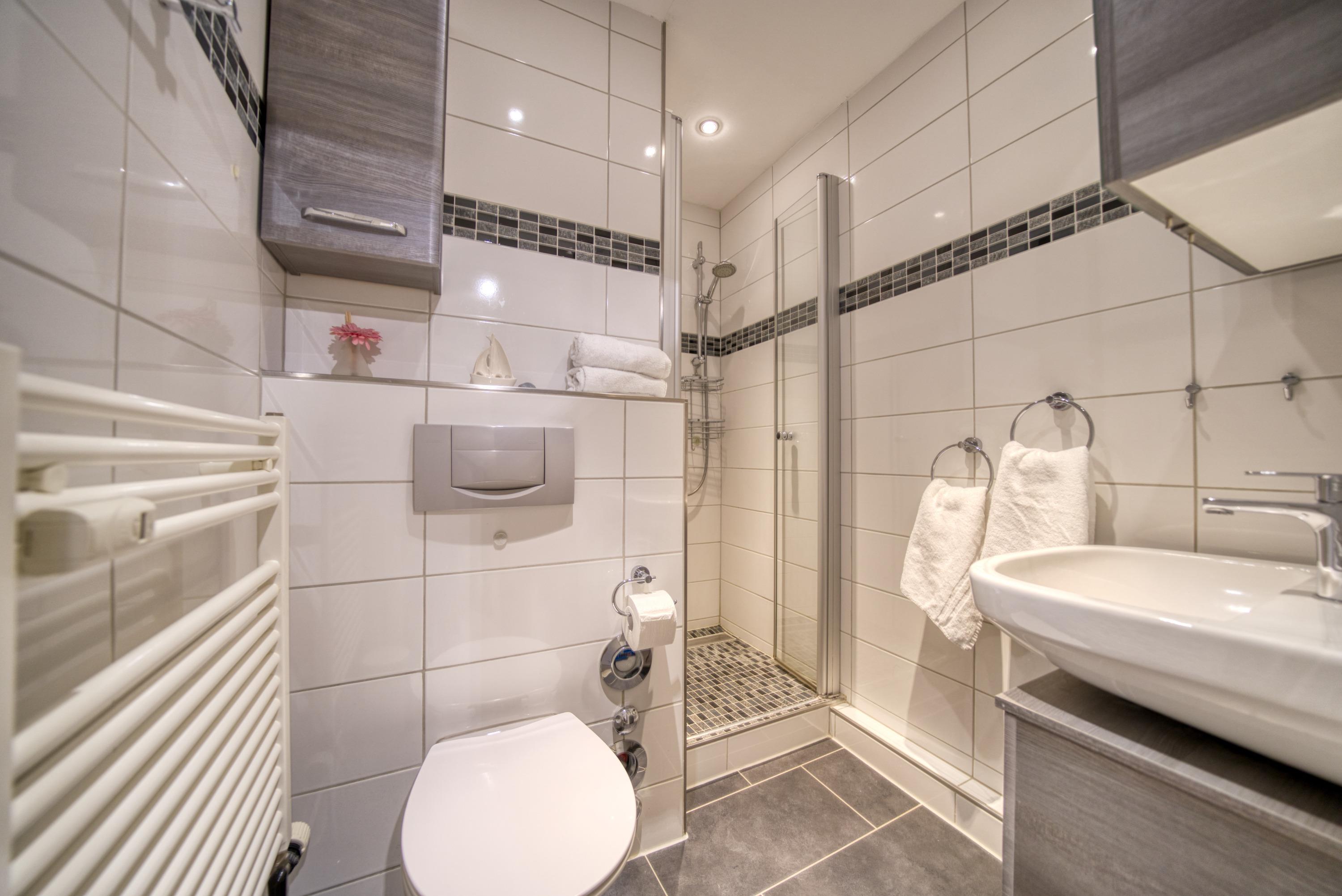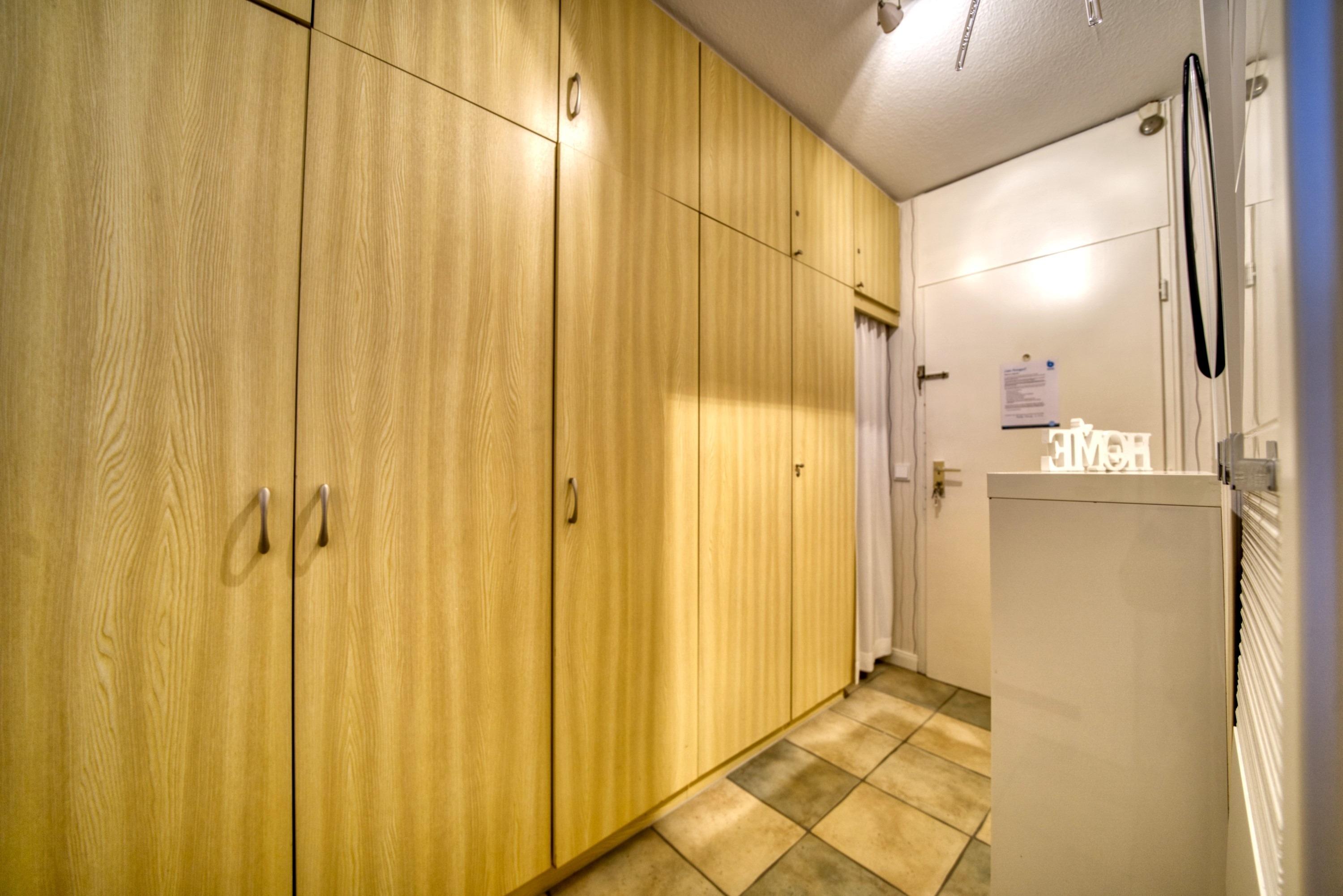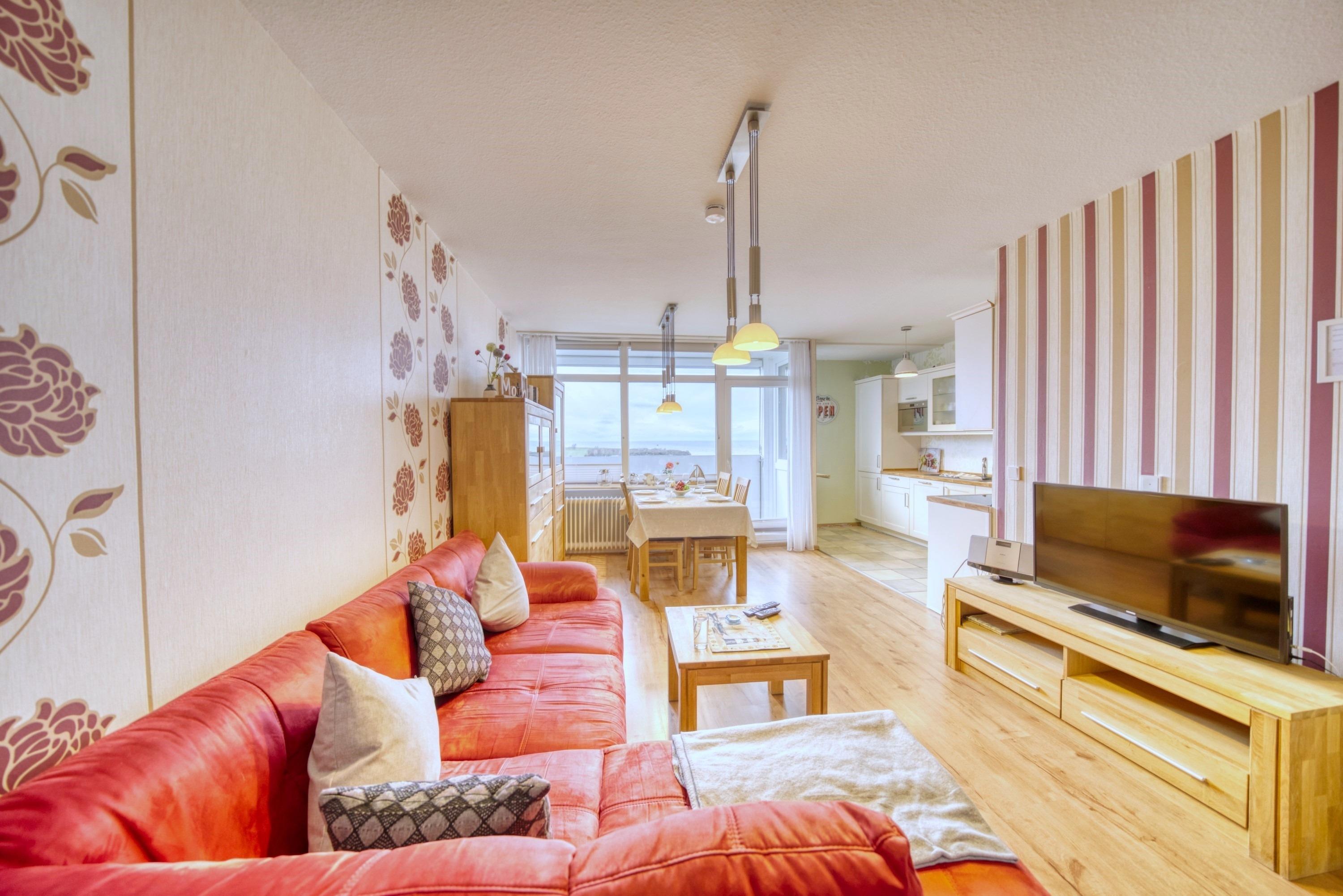 Wohnfläche 45?qm. Wohn-/Esszimmer mit Schlafcouch (2,45?m × 1,80?m), Elternschlafraum mit Doppelbett. Moderne Küche mit Kaffeemaschine, Wasserkocher, Toaster, Kühlschrank mit Gefrierfach, 4-Platten-Herd und Backofen. Bad mit WC und Duschkabine. Radio [&] TV im Wohnzimmer. Bonus: WLAN, kostenloser Strandkorb (Mitte Mai–Mitte September). Nichtraucher, keine Haustiere, max. 4 Personen, Fahrstuhl, Fahrradräume, Strand ca. 300?m, Parkplatz kostenlos. Ferienpark mit Schwimmbad, Sauna, Wellness, Läden und Kinderspielwelt.