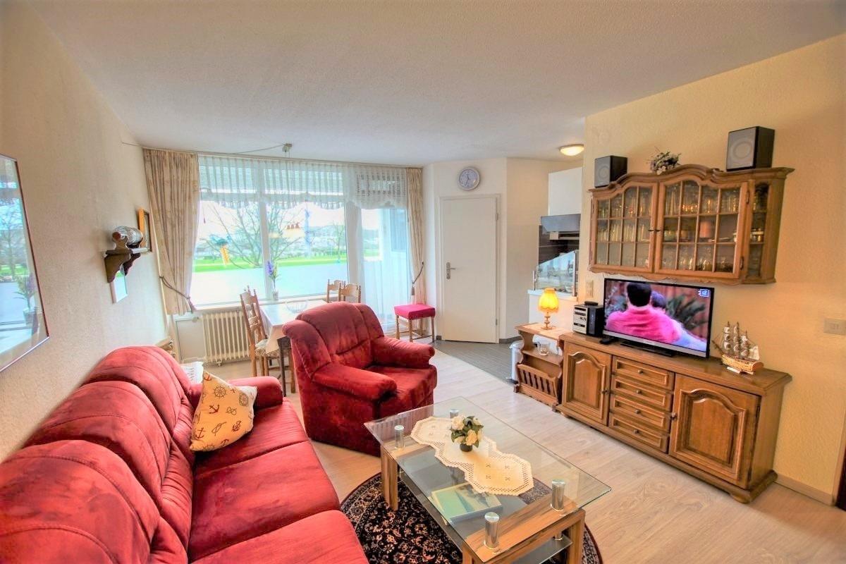45?qm Wohnfläche mit Wohn-Esszimmer (Sofa, Flachbild-TV, Radio), Schlafbereich mit Doppelbett, separates Kinderzimmer mit Etagenbett, voll ausgestattete Küche (Kühlschrank, 4-Platten-Herd, Mikrowelle) sowie Bad mit WC und Dusche. Balkon mit schöner Aussicht. WLAN inklusive. Geeignet für max. 4 Personen, Nichtraucher, keine Haustiere. Fahrstuhl, Fahrradräume, Strand ca. 300?m, kostenfreier Parkplatz vorhanden.