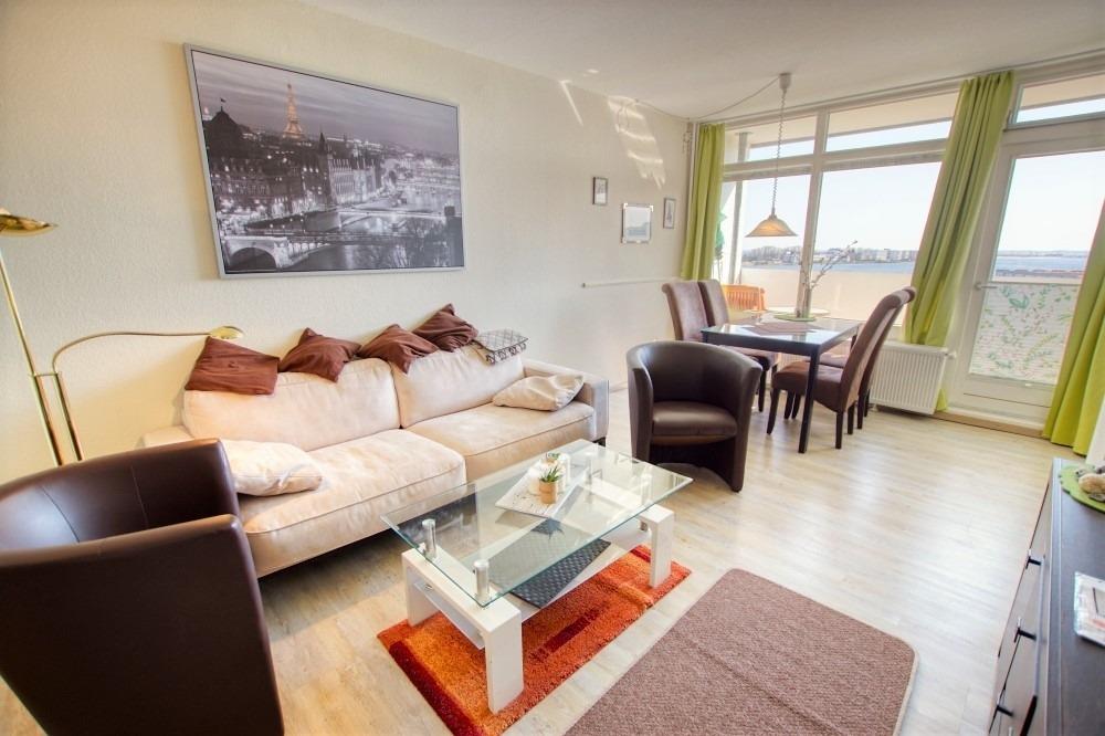 Die Ferienwohnung im Haus F, 6. Etage, mit Balkon zur Ostseite, bietet einen herrlichen Blick auf die Ostsee, den großen Binnensee, die Fehmarnsundbrücke, die Stadt und den Yachthafen.