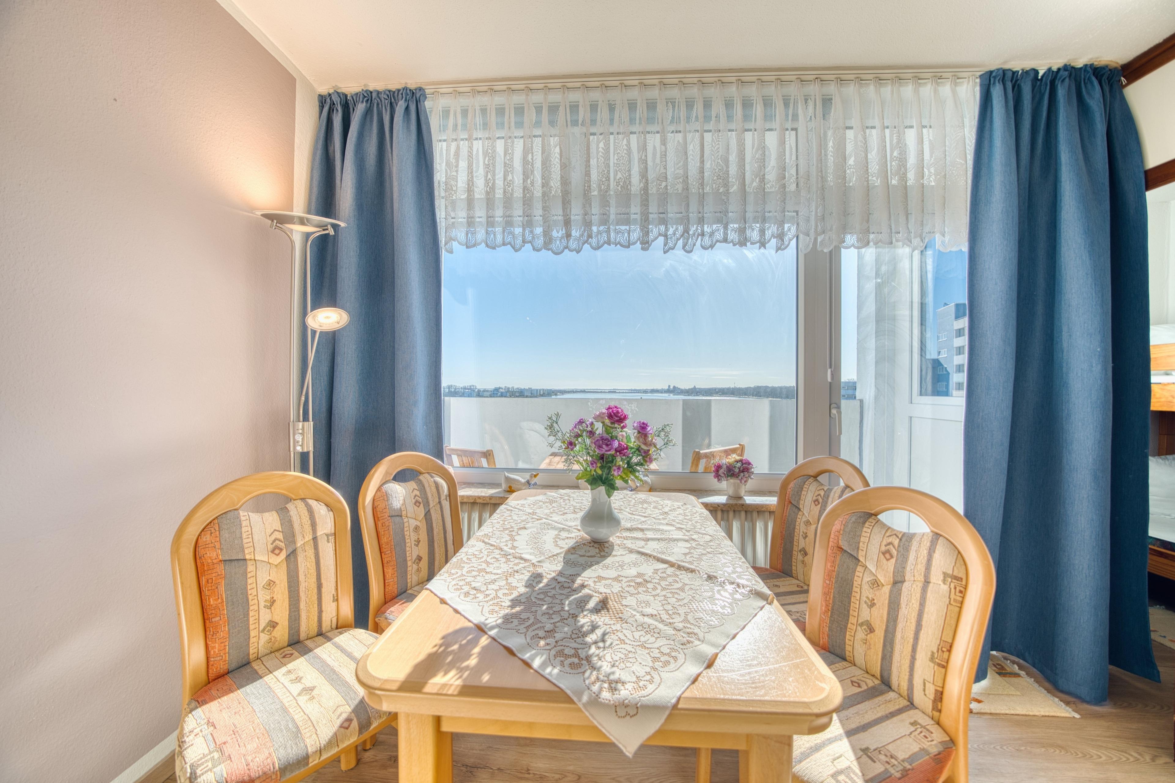 Die Ferienwohnung im Haus F, 6. Etage, mit Balkon zur Ostseite, bietet einen herrlichen Blick auf die Ostsee mit Fehmarnsundbrücke sowie auf den Binnensee mit Stadt- und Yachthafen.