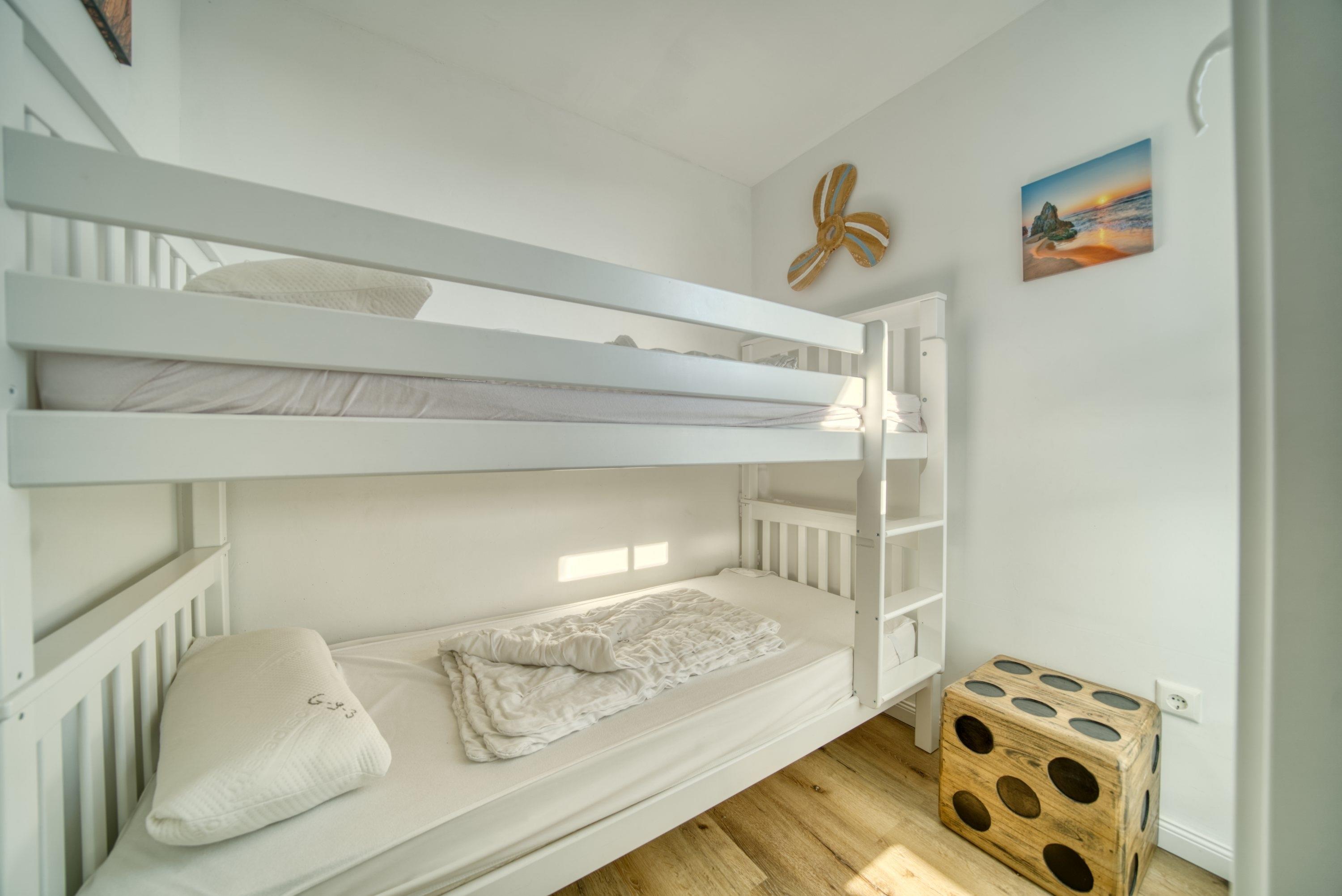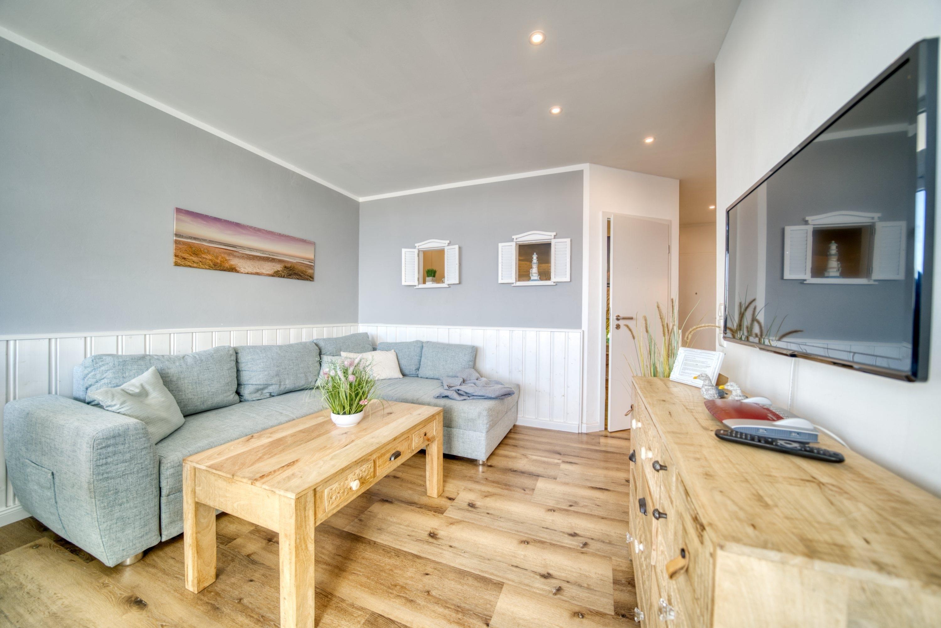 Die Wohnung verfügt über ein helles Wohnzimmer mit gemütlichem Ecksofa, großem Flachbild-TV und Esstisch für 4 Personen am Balkonfenster. Ein separates Schlafzimmer mit Doppelbett und TV sowie ein Kinderzimmer mit Etagenbett sorgen für komfortable Schlafmöglichkeiten. Die moderne Küchenzeile ist mit Cerankochfeld, Backofen, Mikrowelle, Geschirrspüler, Wasserkocher und Kaffeemaschine ausgestattet. Das Badezimmer bietet eine Dusche mit niedrigem Einstieg und Handtuchtrockner. WLAN ist kostenfrei verfügbar.