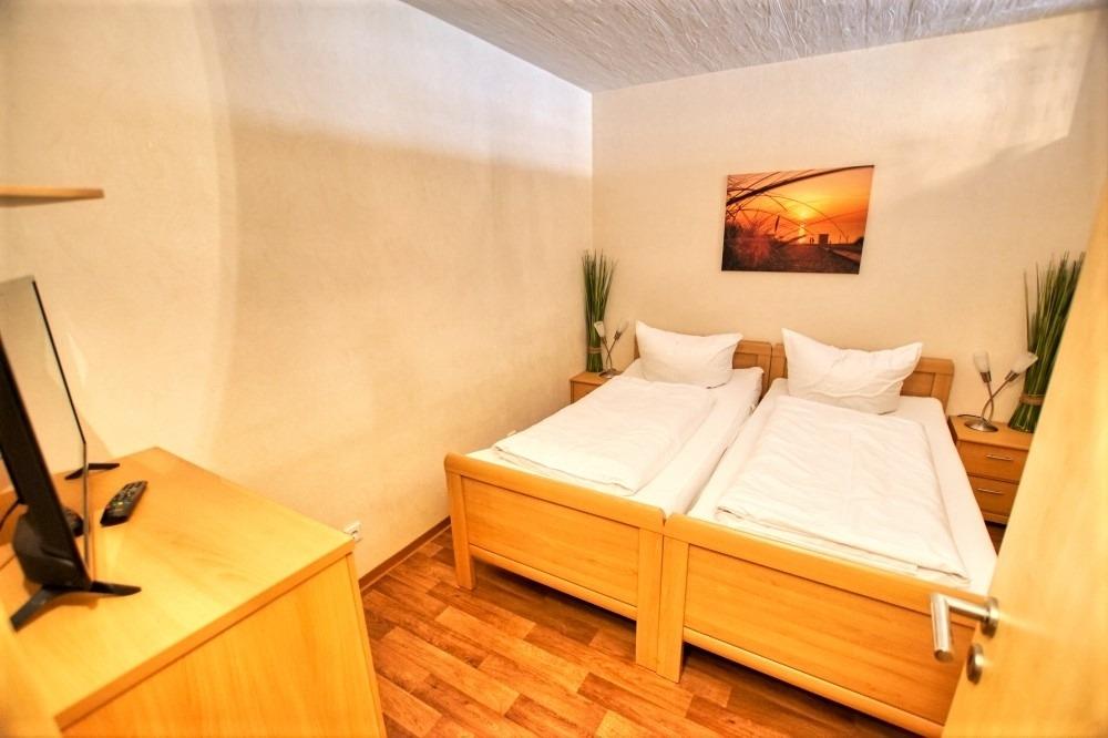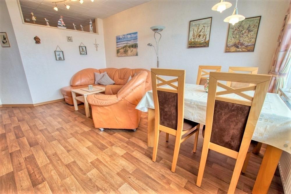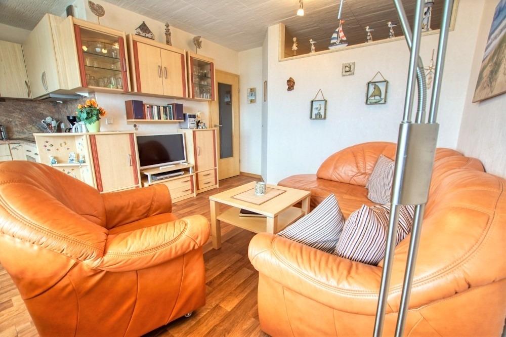 Die Wohnung bietet Wohnzimmer mit Ledercouch, Sessel, Flachbild-TV und Westbalkon mit Markise, separaten Schlafbereich mit Doppelbett und TV, Kinderzimmer mit Etagenbett, Essbereich für 4 Personen und Vinylboden. Die offene Küche ist ausgestattet mit Ceranfeld, Backofen, Mikrowelle, Kühlschrank mit Gefrierfach, Geschirrspüler, Kaffeemaschine, Toaster, Eierkocher und Wasserkocher. Modernes Duschbad mit Fußbodenheizung. WLAN inklusive. Nichtraucher, keine Haustiere, Fahrstuhl, Fahrradräume, ca. 300?m zum Strand, Parkplatz hinter dem Ferienpark.