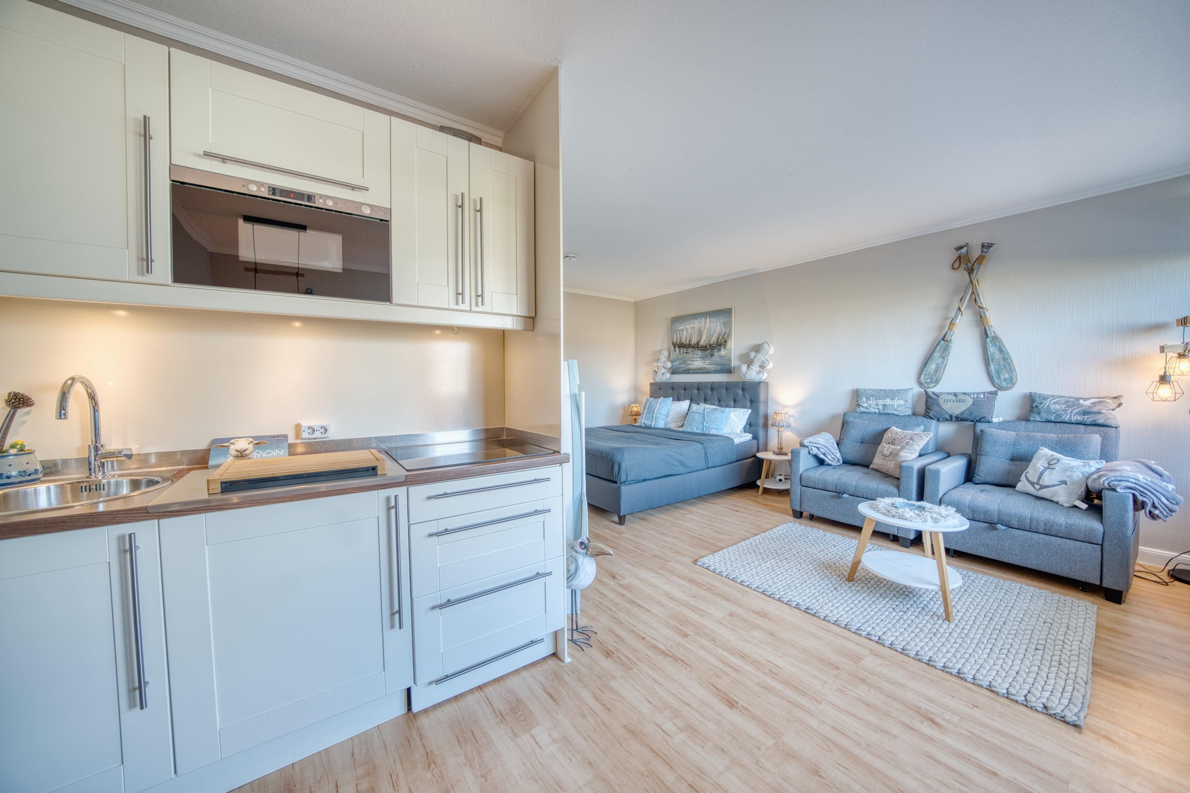Die Wohnung verfügt über Wohn-Schlafbereich mit Doppelbett, zwei Sessel mit Schlaffunktion für die 3. Person, Flachbild-TV und Laminatboden. Die Küchenzeile ist ausgestattet mit Induktionsherd, Mini-Backofen, Mikrowelle, Kühlschrank mit Gefrierfach, Kaffeemaschine und Wasserkocher. Modernes Duschbad mit WC und Handtuchtrockner. Kostenfreies WLAN, Nichtraucher, keine Haustiere, Fahrstuhl, Fahrradräume, kostenfreier Parkplatz vorhanden. Strand ca. 300?m entfernt. Aktiv-Hus, Restaurants und Einkaufsmöglichkeiten in direkter Nähe.