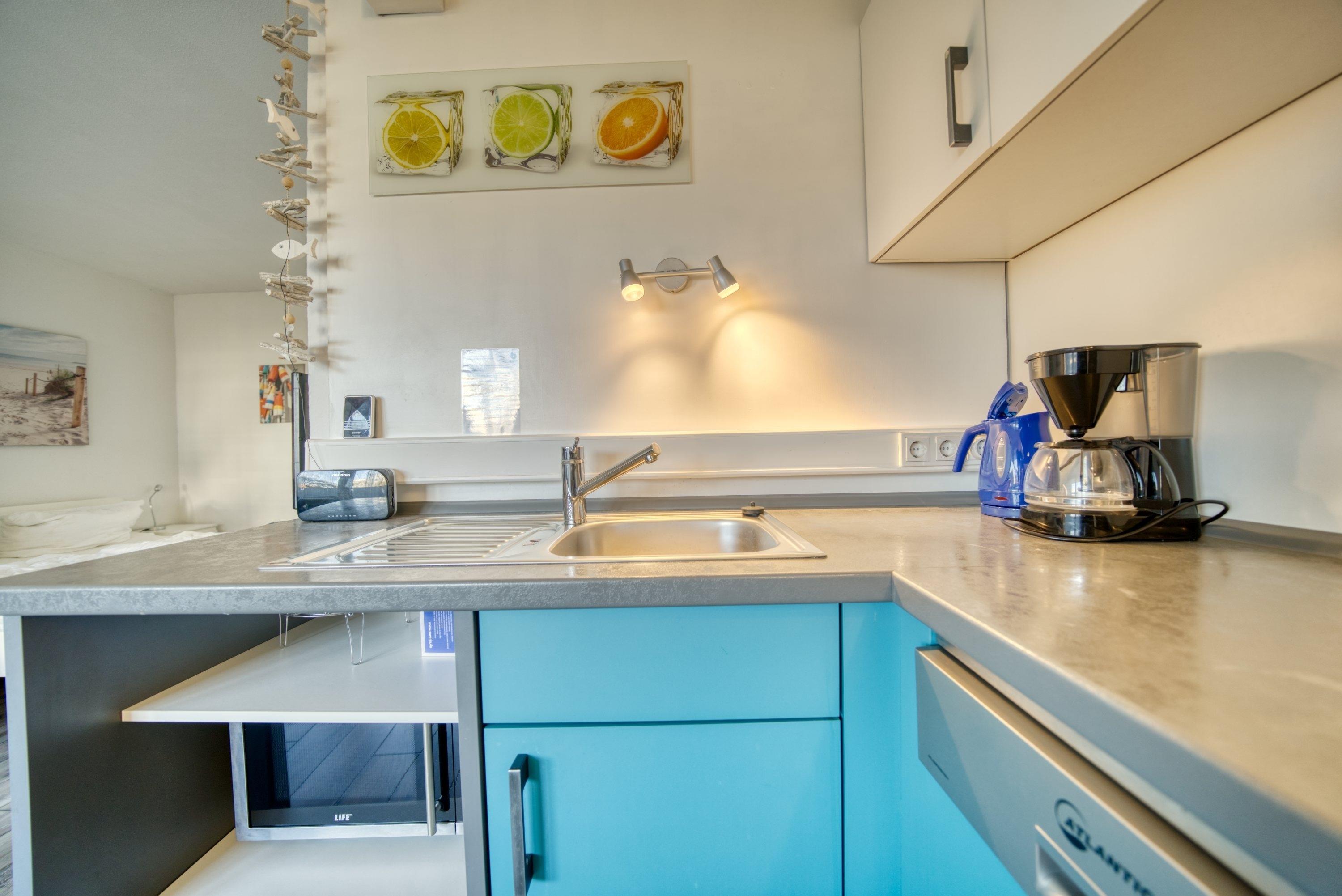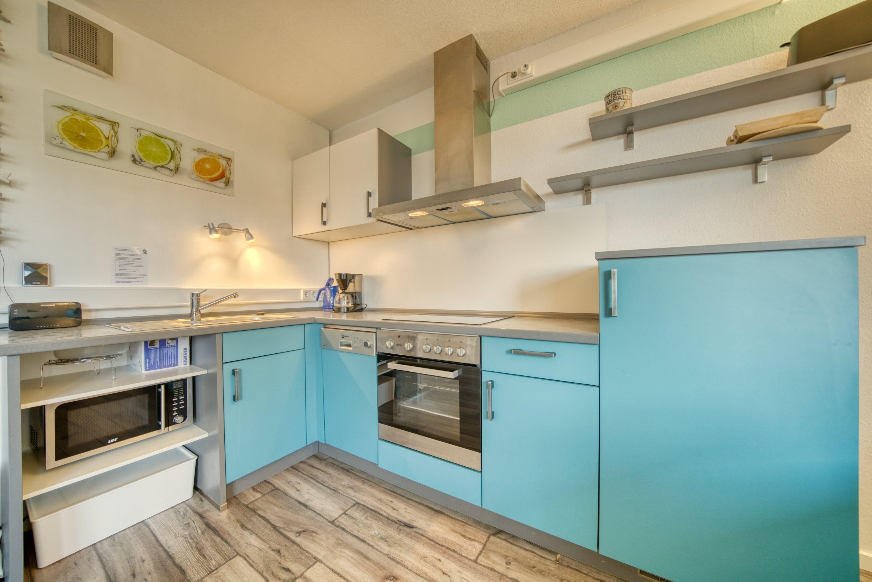 Wohn-Schlafraum mit Doppelbett für 1–2 Personen, Wohn-/Esszimmer mit Sofa, Flachbild-TV und Radio, abgetrennter Schlafbereich. Komplett ausgestattete Küche mit Kühlschrank, Gefrierfach, Backofen, Cerankochfeld, Geschirrspüler, Kaffeemaschine, Wasserkocher, Toaster und Geschirr. Bad mit WC, Dusche und Waschbecken. Laminatboden, Allergikerfreundlich. Balkon mit Blick auf den Innenhof. Nichtraucherwohnung, keine Haustiere, maximal 2 Personen. Kostenfreier PKW-Stellplatz, Fahrstuhl vorhanden, Strand ca. 300?m. Einkaufsmöglichkeiten, Restaurants, Bars, Spielplätze und Aktiv-Hus in der Nähe.