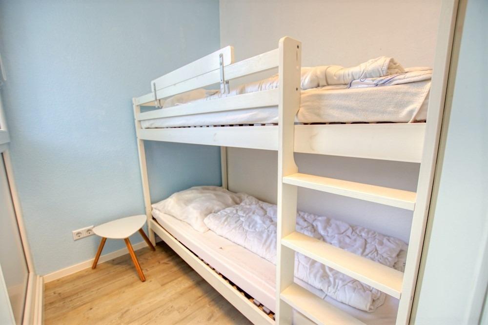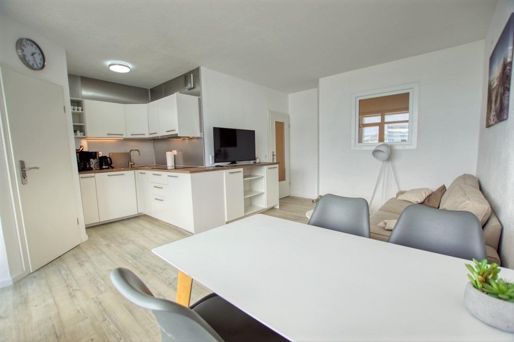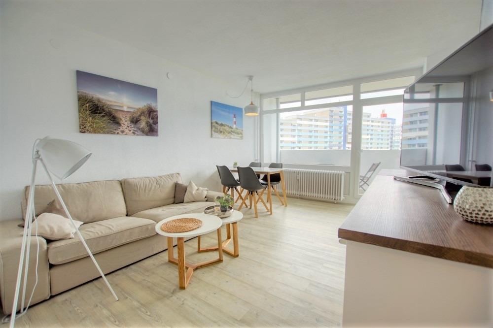 Die helle und modern ausgestattete Wohnung befindet sich im Haus N im Ferienpark, 7. Etage, und verfügt über einen Balkon zum Innenhof mit Blick auf den Binnensee sowie die Ostsee Richtung Fehmarn. Auf 45 qm bietet sie ein Wohn-Esszimmer, ein Elternschlafzimmer mit Doppelbett, ein Kinderzimmer mit Etagenbett sowie eine neu eingerichtete Küche mit Kühlschrank, großem Geschirrspüler, 4-Zonen-Ceran-Kochfeld, Nespresso-Maschine und Kaffeemaschine. Der Wohnbereich ist mit Smart-TV ausgestattet, das Bad verfügt über Dusche und WC.