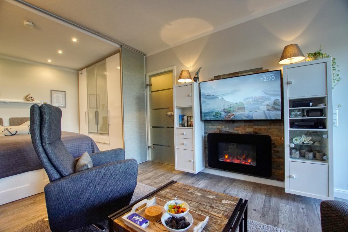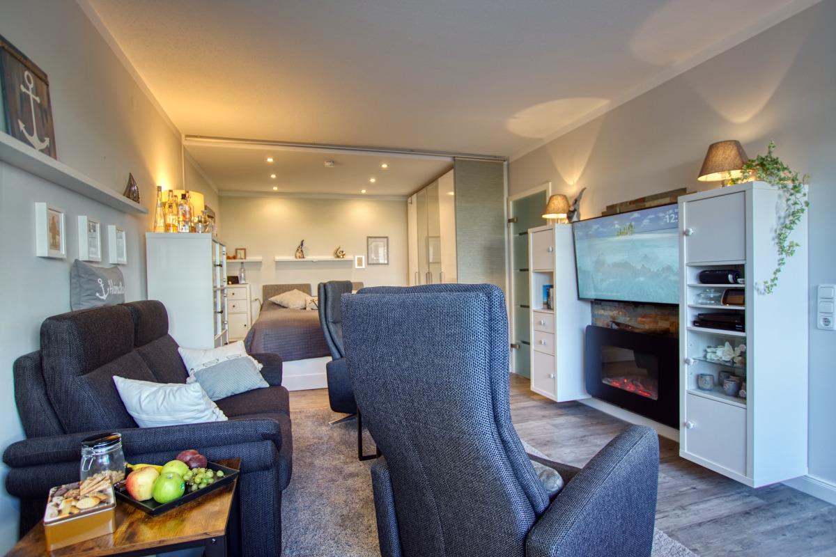 Wohn-Esszimmer mit Couch und Flachbild-TV, Schlafbereich mit Doppelbett, Küche mit Kühlschrank, 4-Plattenherd, Backofen und Geschirrspüler, Bad mit WC und Dusche. WLAN, Balkon mit Innenhofblick. Nichtraucherwohnung, keine Haustiere. Belegung bis 2 Personen. Ca. 300?m zum Strand, Nähe Aktiv-Hus mit Schwimmbad, Sauna, Wellness und Gastronomie.