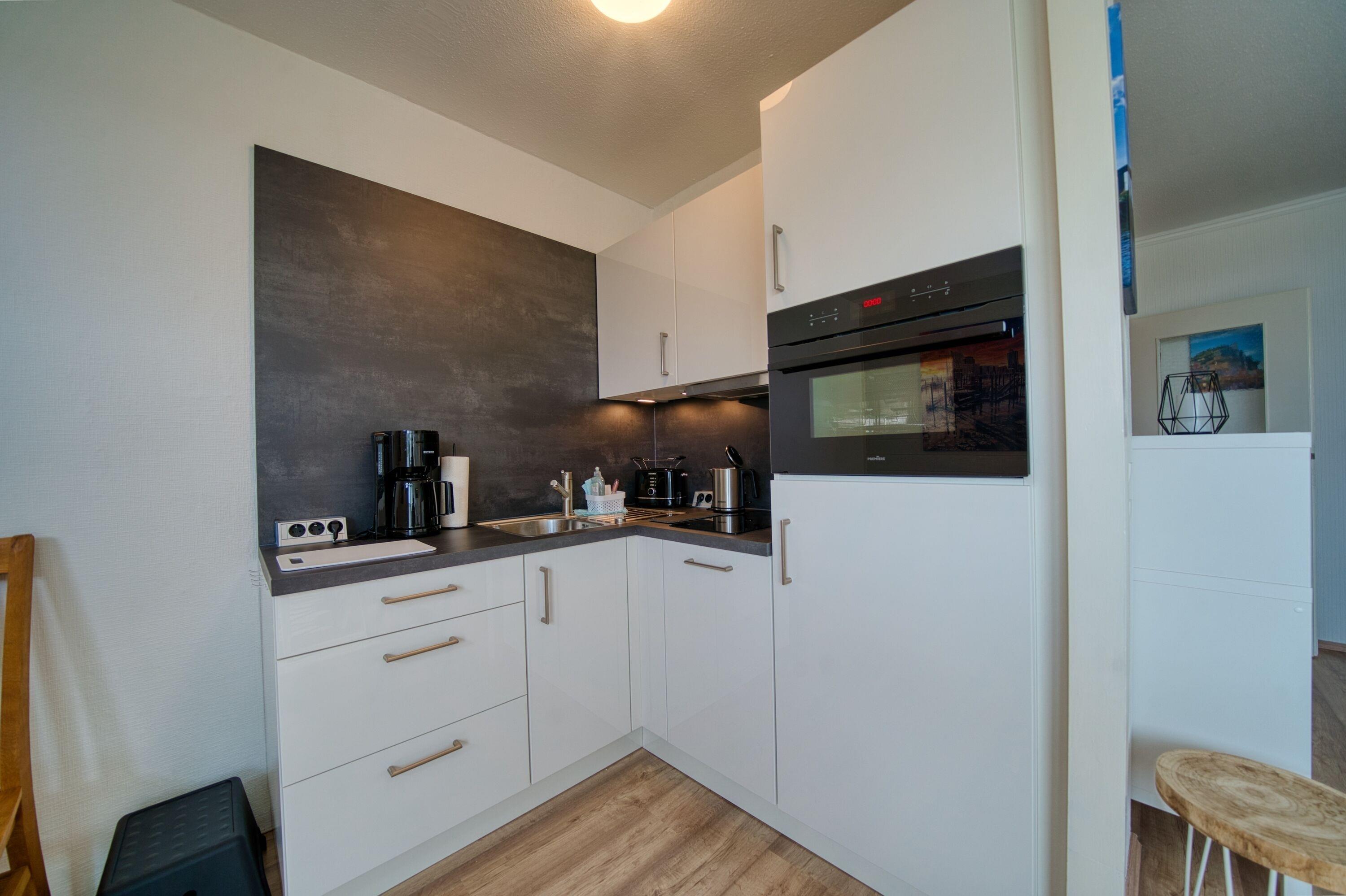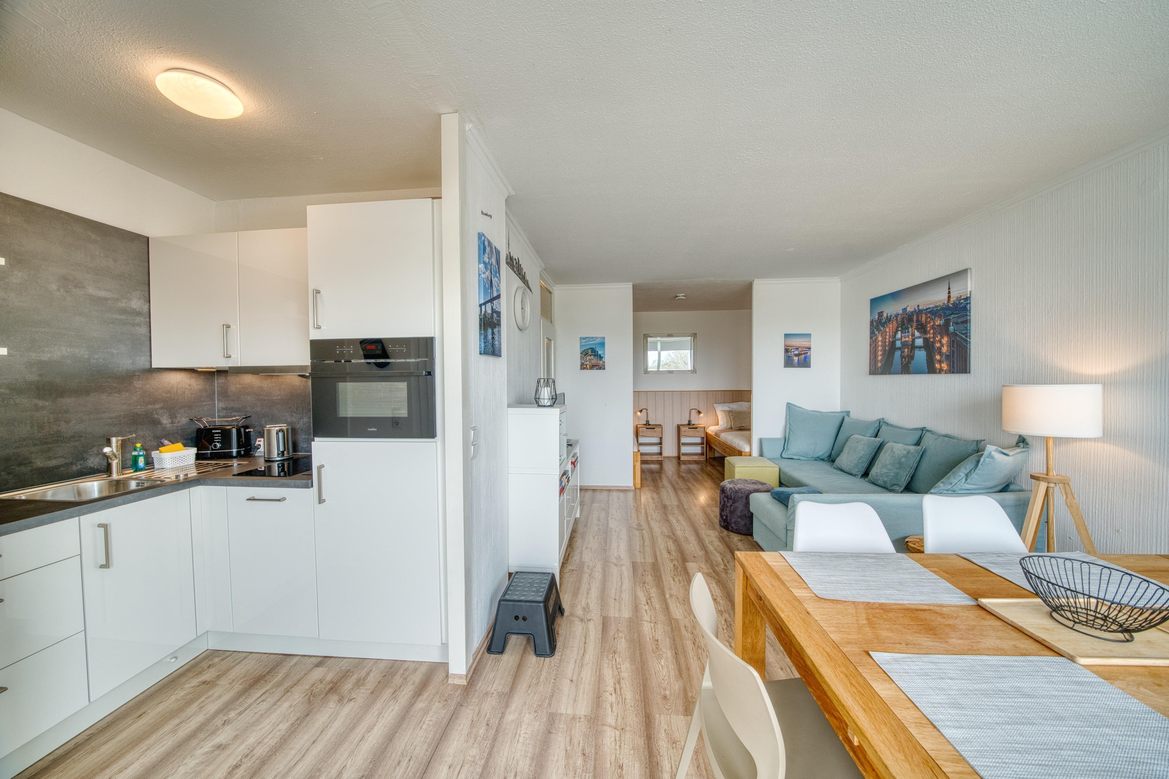 Wohn-/Schlafzimmer mit zwei Einzelbetten, Etagenbett, Flachbild-TV, Esstisch. Küche mit Ceranfeld, Backofen, Mikrowelle, Geschirrspüler, Kühlschrank, Kaffeemaschine, Wasserkocher, Toaster. Bad mit Dusche, WC und Handtuchtrockner. Balkon mit Grünblick. Nichtraucherwohnung, keine Haustiere, WLAN inklusive, Fahrstuhl, Fahrradräume. Strand ca. 300?m, Parkplatz gratis. Perfekt für Ruhe, Komfort und erholsame Ostsee-Tage.