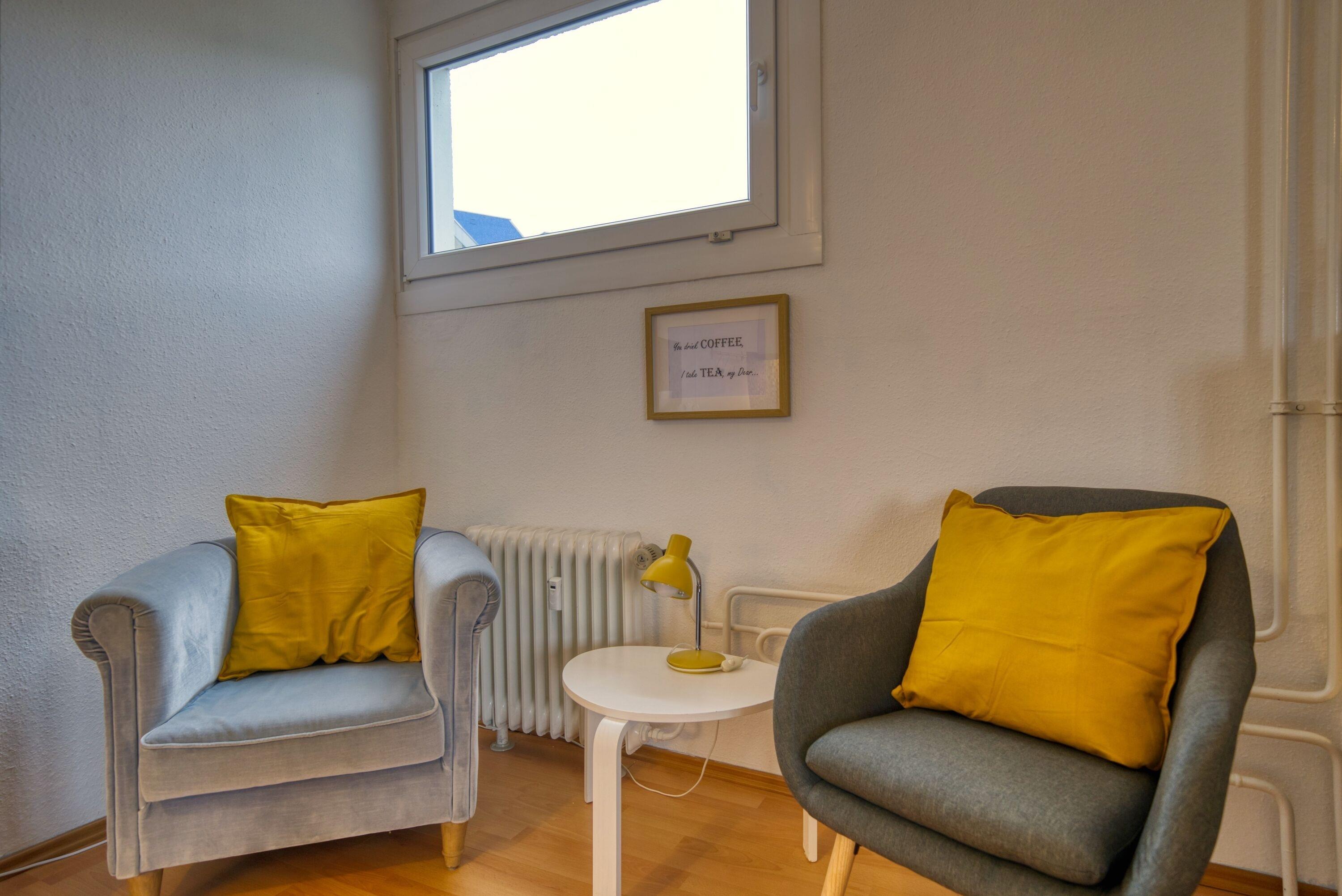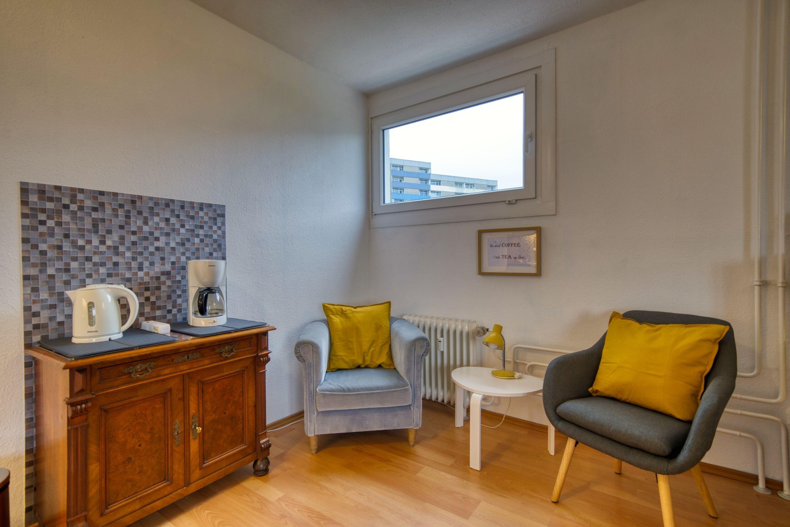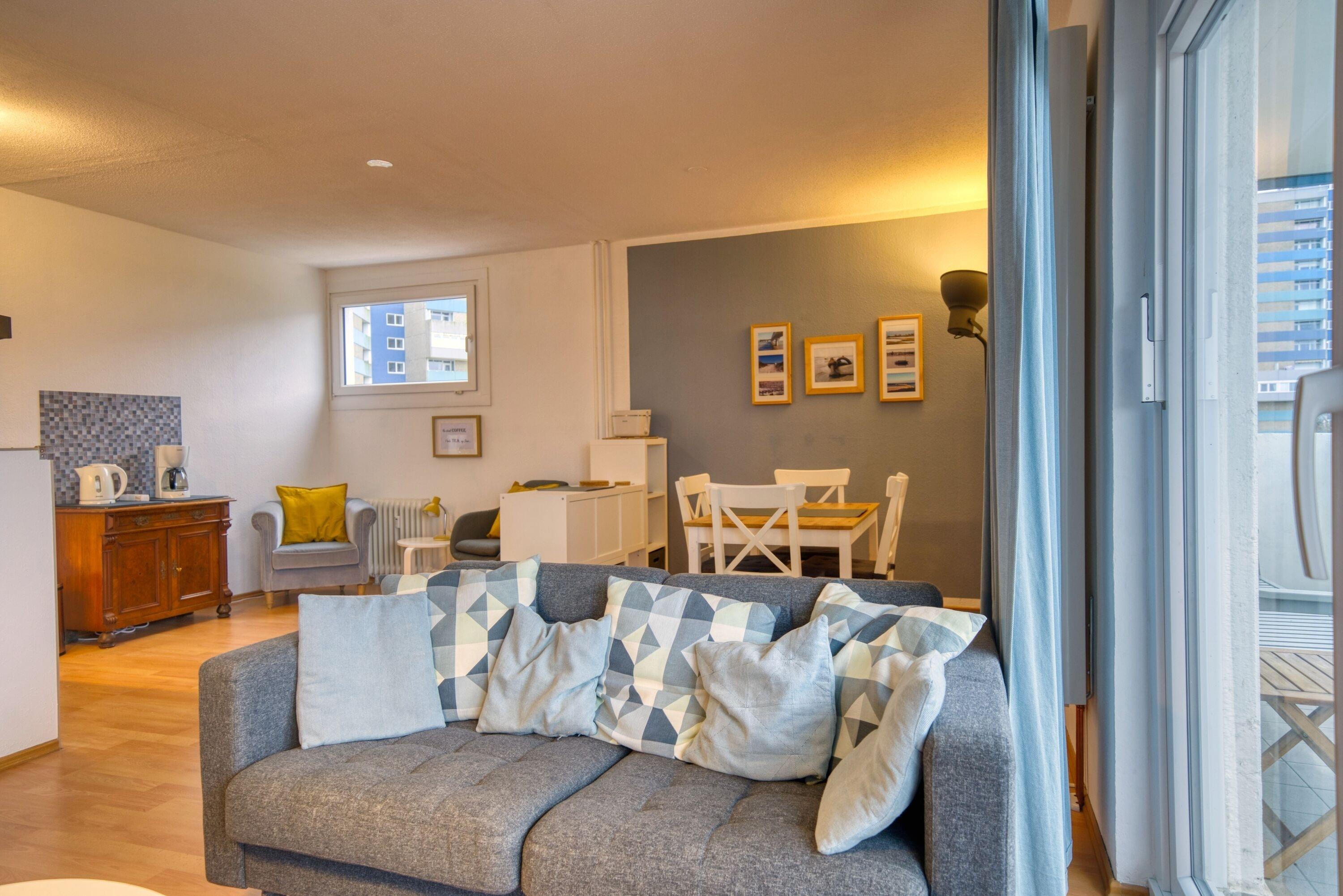 Die Wohnung verfügt über einen komfortablen Wohn- und Essbereich, einen separaten Schlafbereich mit Doppelbett, Laminatfußboden sowie Flachbild-TV und Radio. Der Essbereich bietet direkten Zugang zum Balkon.